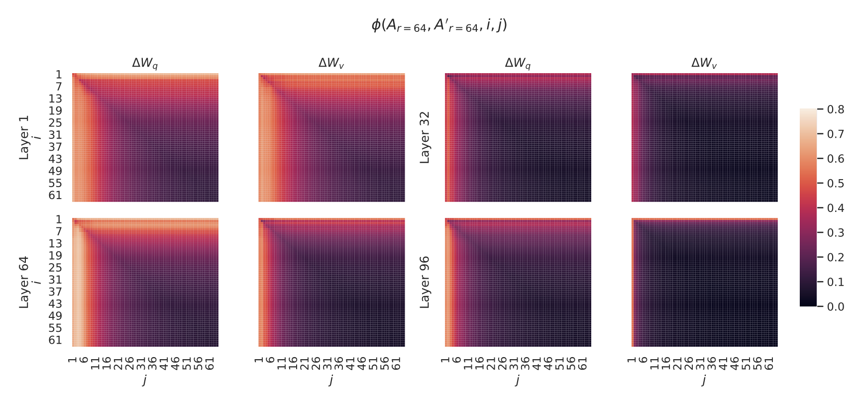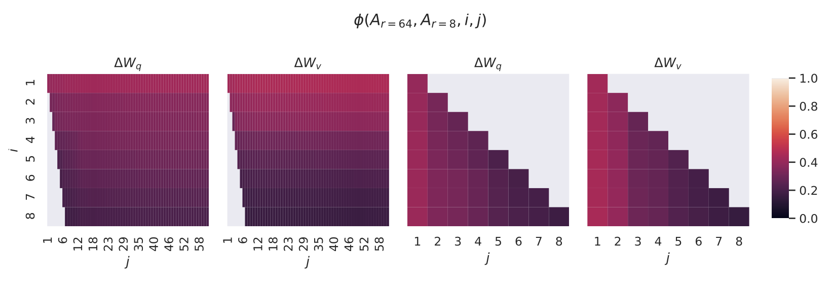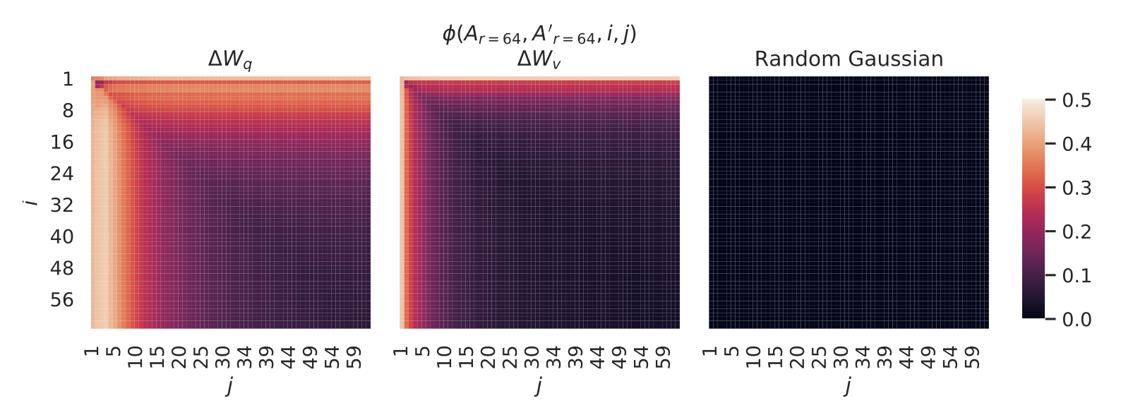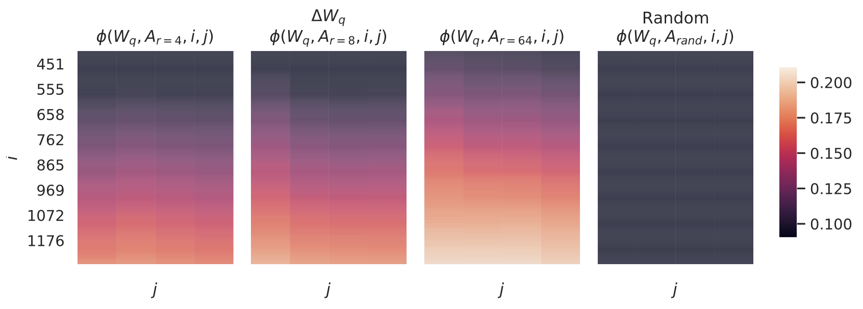 대조적으로, $r = 4$인 랭크-4 버전(rank-4 version) 의 $\Delta W$ 에서는