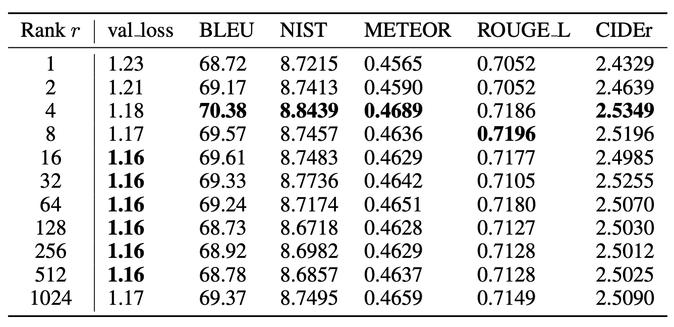 BLEU 점수가 $r = 4$일 때 각각 최고 성능을 보였다.