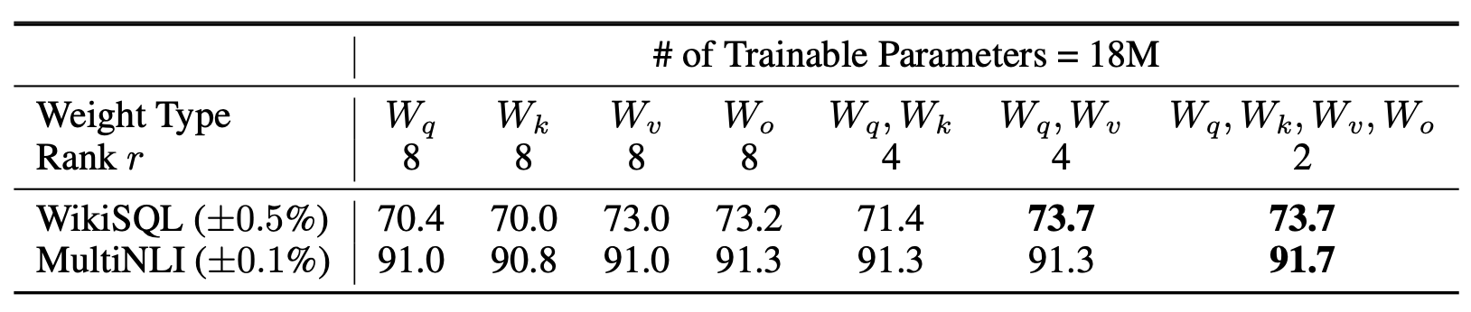 서로 다른 랭크(rank) r 값에서 LoRA가
