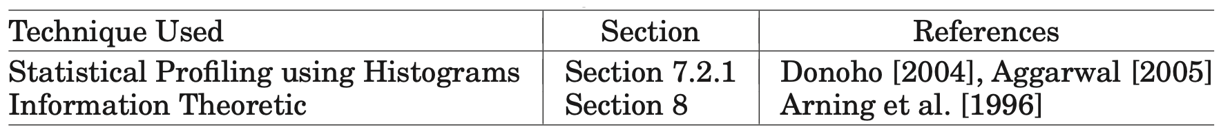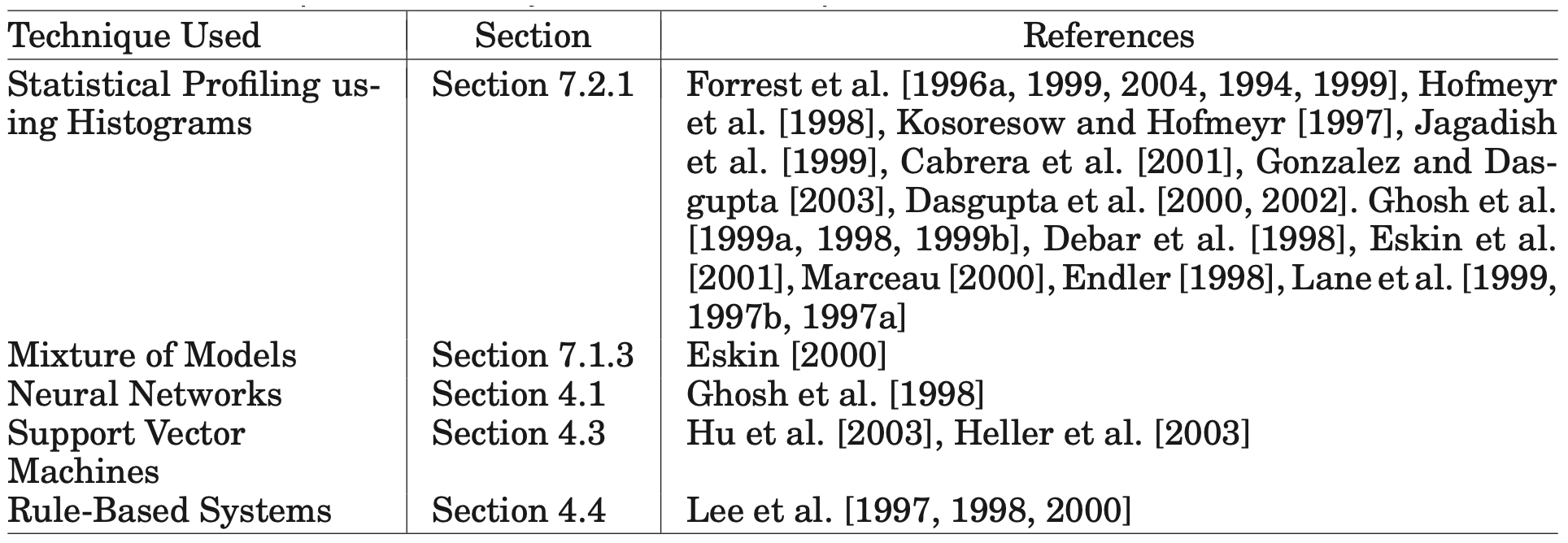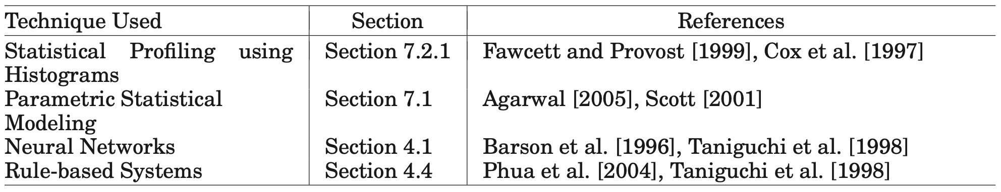 이 도메인에서 사용되는 일부 이상 탐지 기법은 표 6에 나열되어 있다.