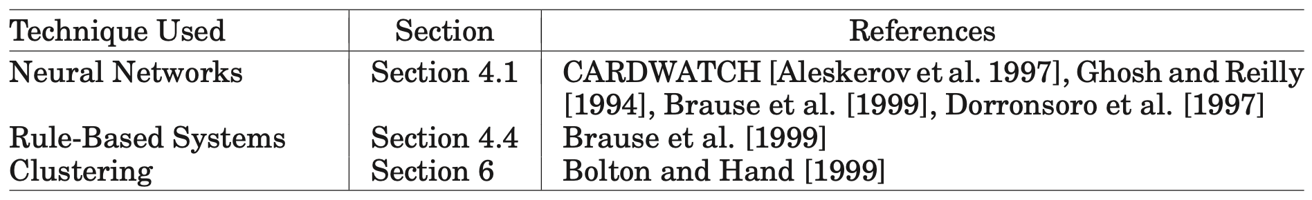 표 4. 신용 카드 사기 탐지를 위해 사용되는 이상 탐지 기법의 예시