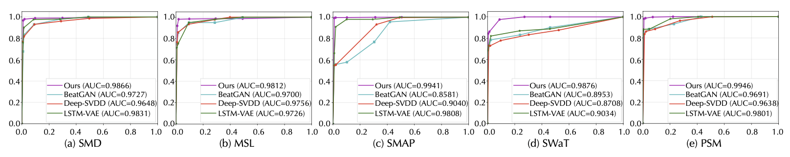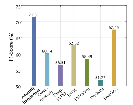 Anomaly Transformer 는 이 도전적인 벤치마크에서도 여전히 최첨단(state-of-the-art) 성능을 달성하였다.