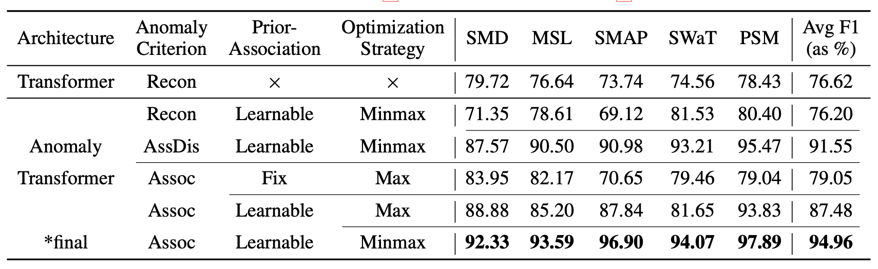 - Ours : 제안된 Anomaly Transformer