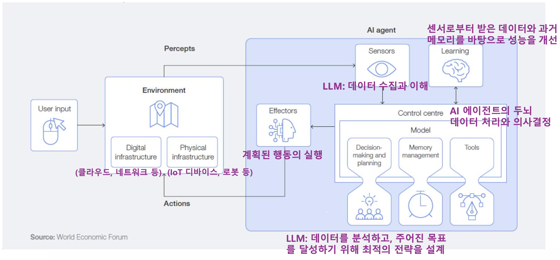 AI 에이전트는 환경(Environment), 센서(Sensors), 학습(Learning), 컨트롤 센터(Control Centre),