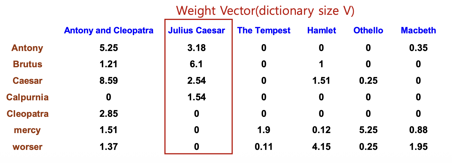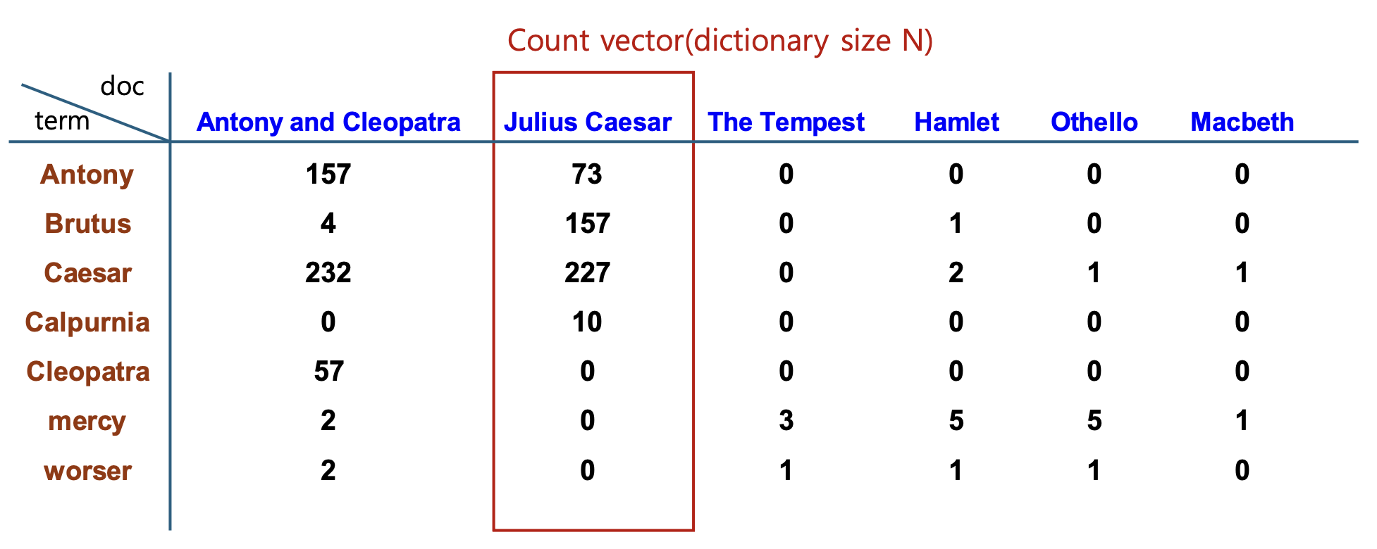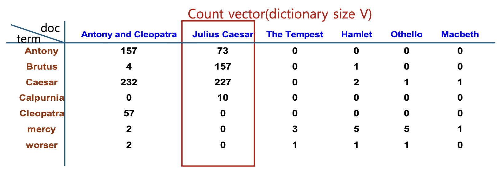 - 각 셀에는 해당 단어가 해당 문서에서 등장한 횟수가 들어간다.