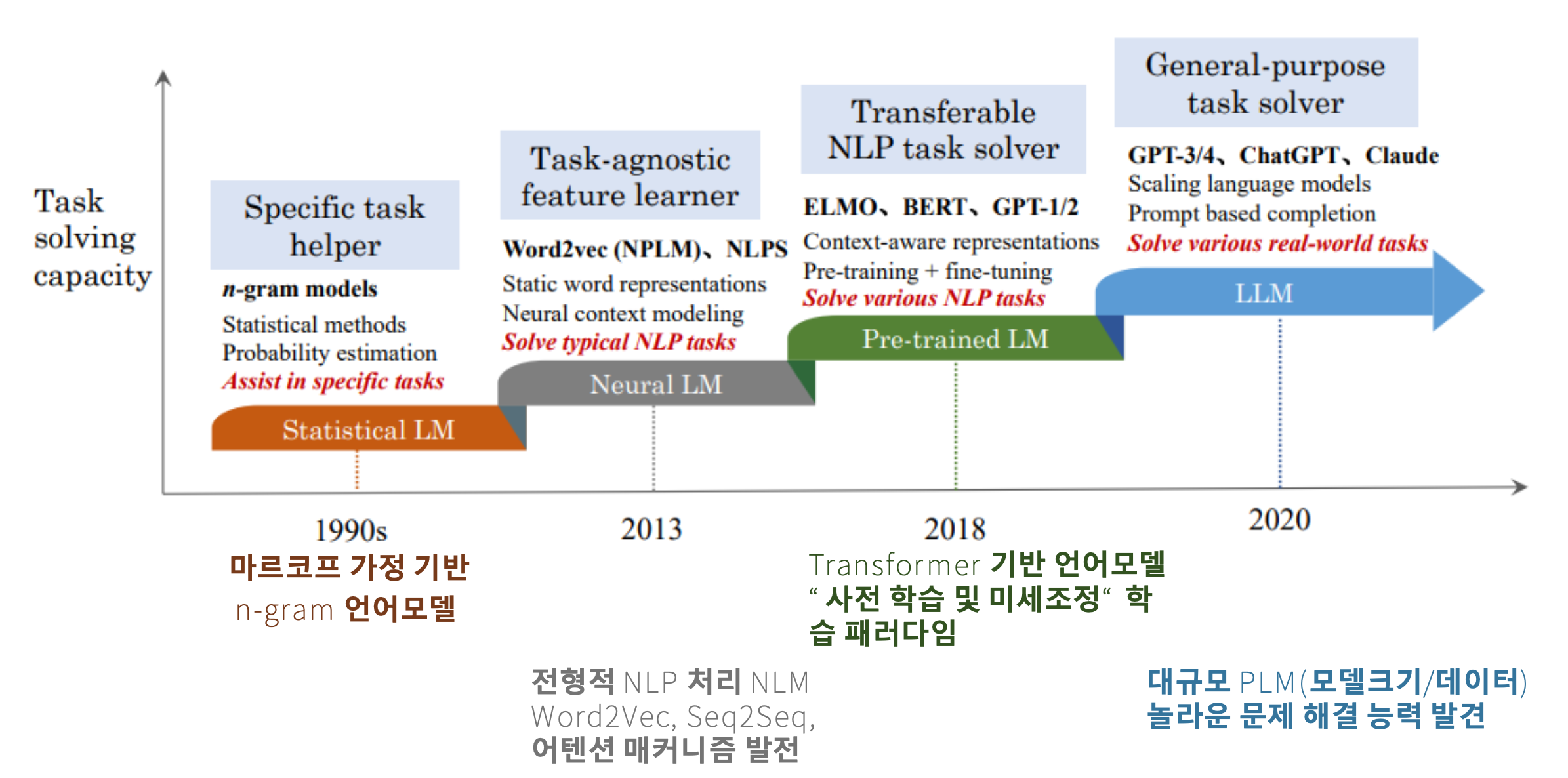 n-gram → Neural LM → Pre-trained LM → LLM으로 발전하며
