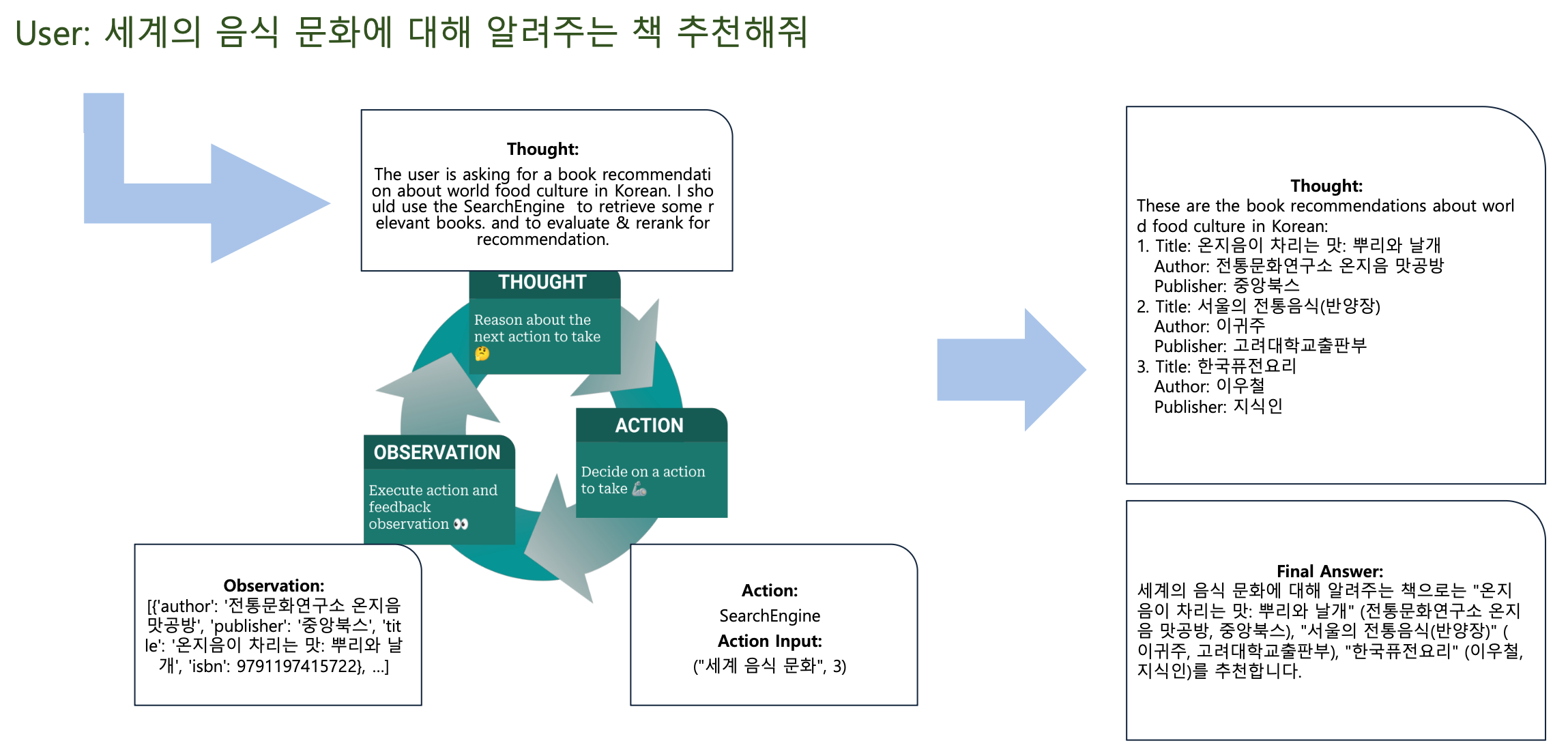 - 그러나 ReAct는 추론(Reasoning)과 행동(Action)을 결합하여, 모델이 스스로 생각한 계획(Thought)을 실행(Action)하고 그 결과를 다시 반영(Observation)하는 순환 구조를 만든다.