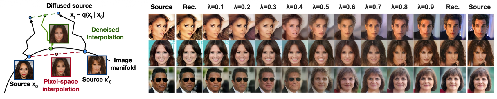 그림 9는 CelebA 256×256 이미지 쌍 사이의 보간(interpolation)을 보여주며,