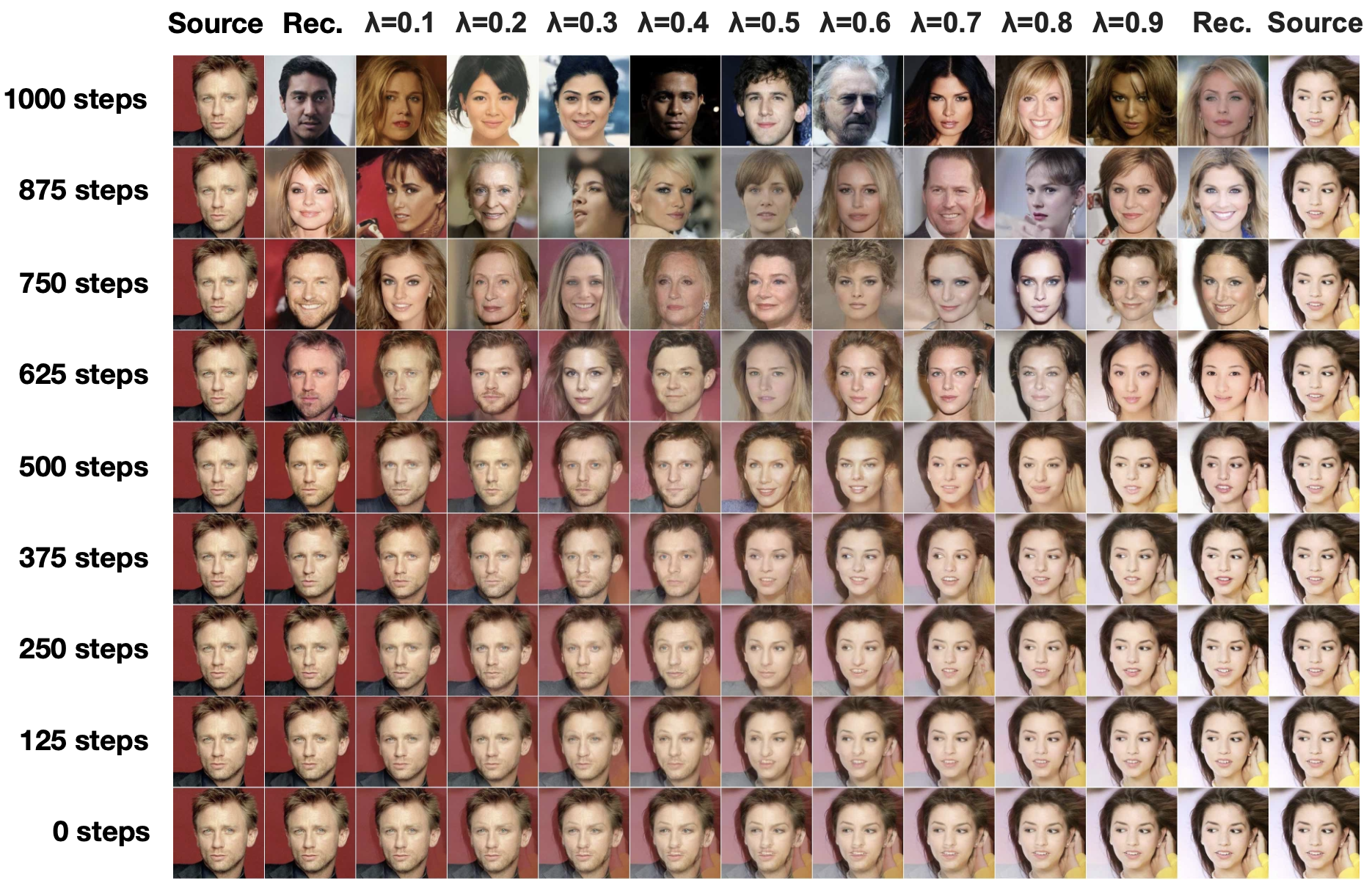 이는 잠재 공간(latent space) 보간 이전에 수행된 확산 단계(diffusion step)의 수를 변화시키면서 얻어진 것이다.