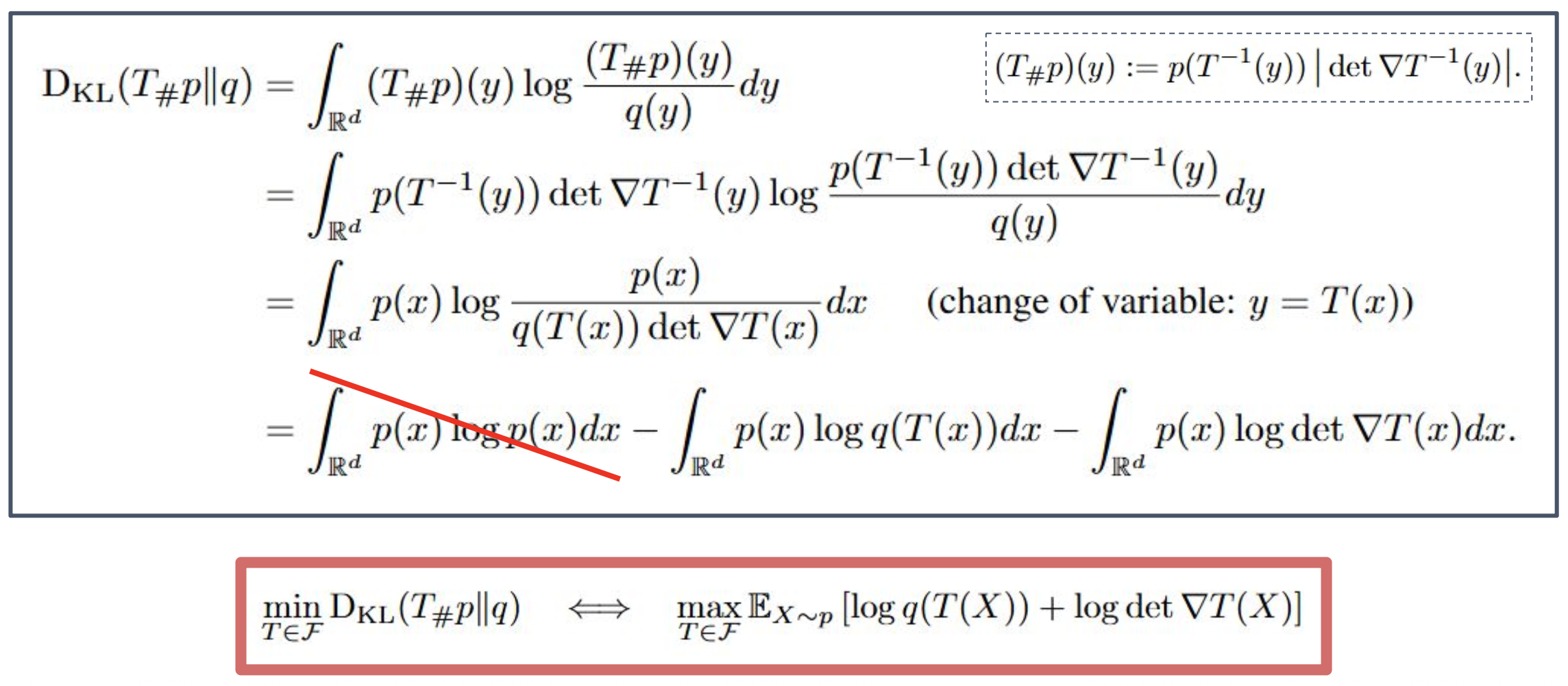 \(-\frac{1}{n}\sum_{i=1}^{n}\Big(\log g\!\circ\!T(\theta)(x_i)+\sum_{j=1}^{d}\log(\nabla T(\theta))_j(x_i)\Big)\)