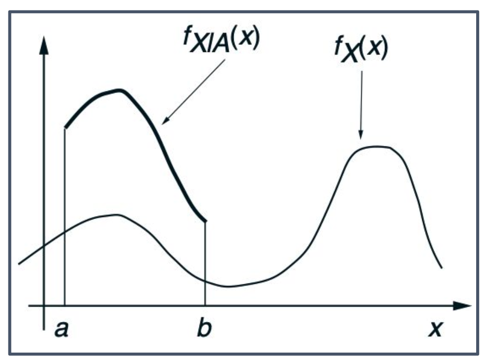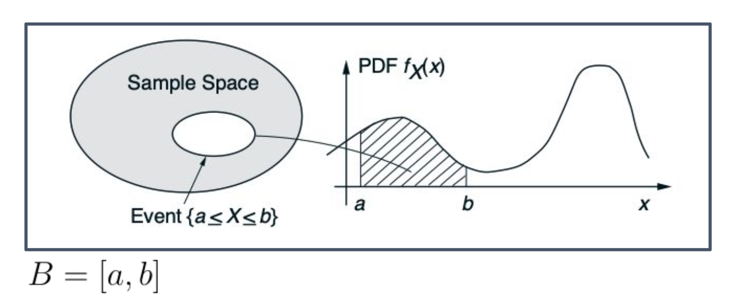 \[P(X \in B) = \int_B f_X(x)\, dx,\] \[P(a \leq X \leq b) = \int_a^b f_X(x)\, dx,\]이는 확률밀도함수 그래프 아래의 적분된 면적으로 해석될 수 있다.