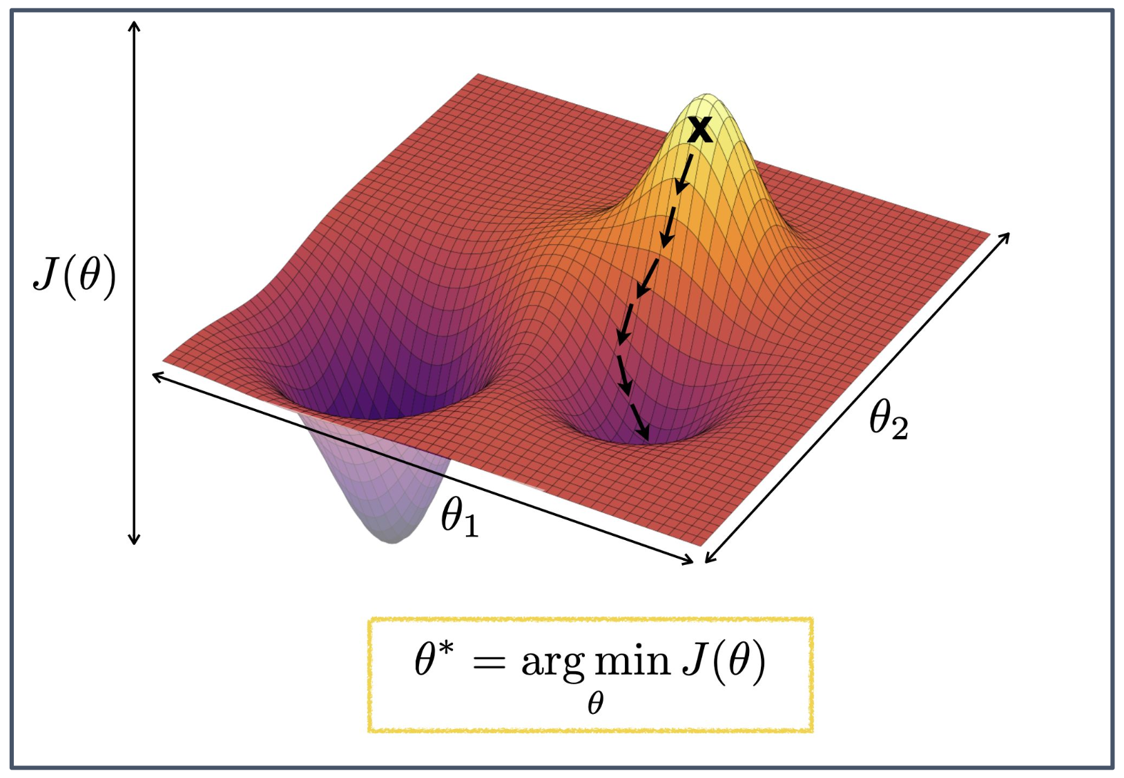 - 따라서 학습은 결국 목적 함수 $J(\theta)$ 를 최소화하는 최적화 문제로 귀결된다.