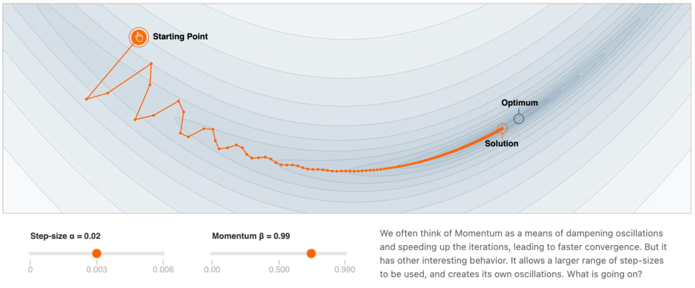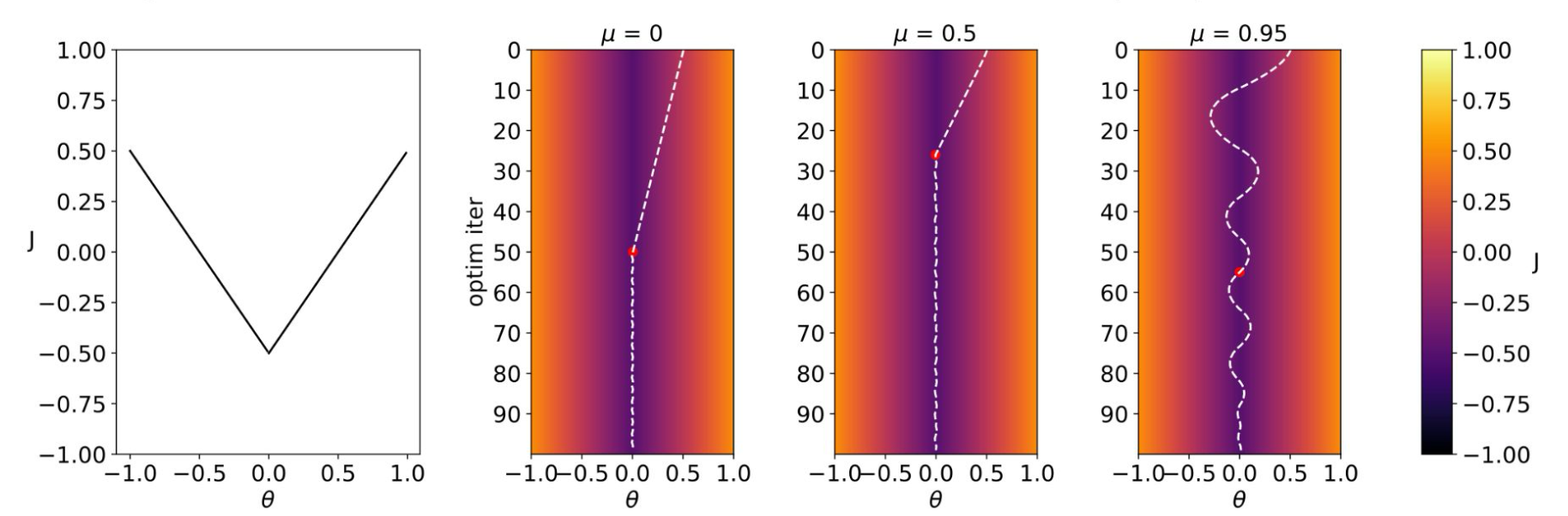 - 그래디언트 스텝은 이전 업데이트 방향을 계속 따르는 쪽으로 편향된다.