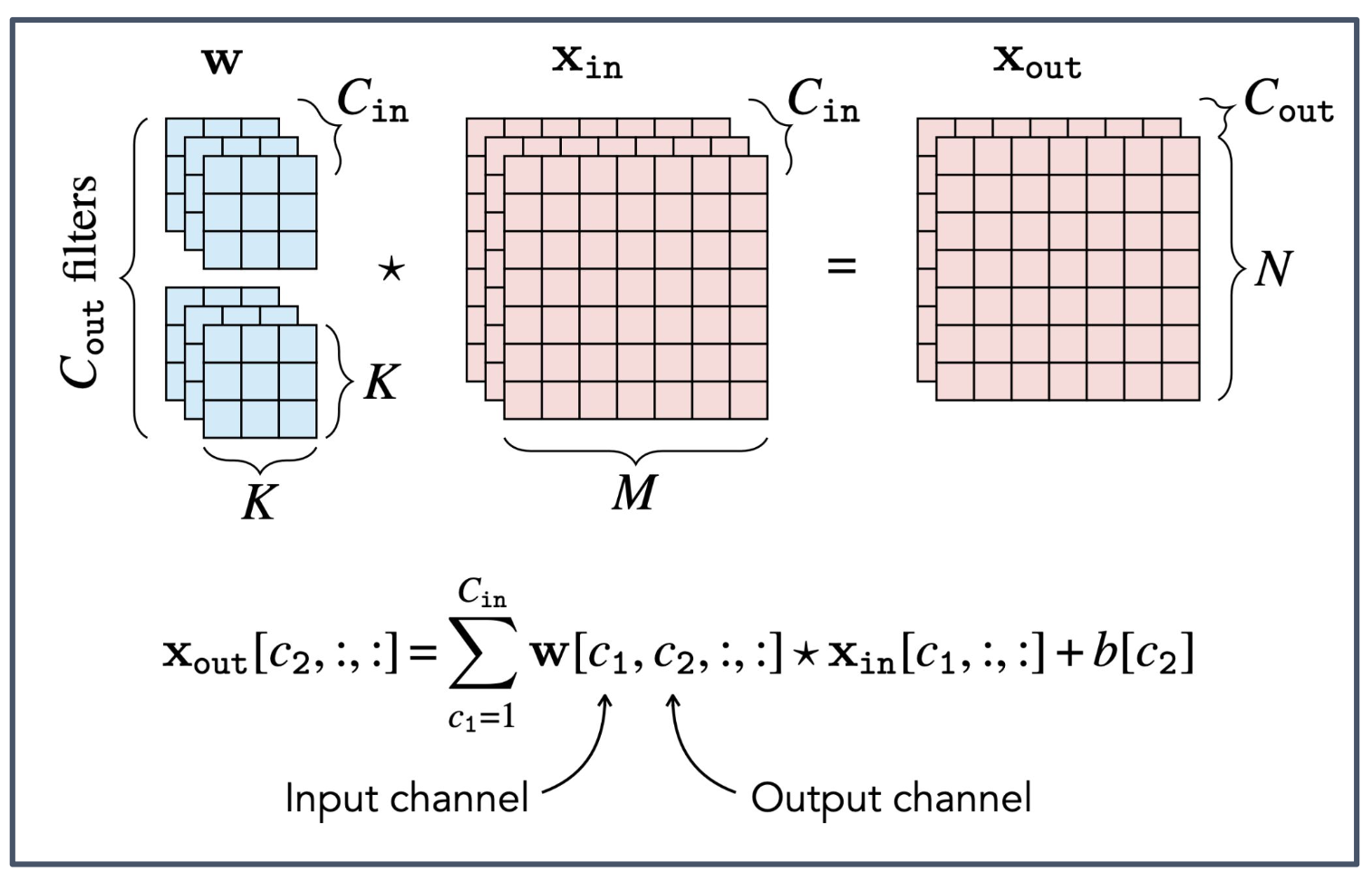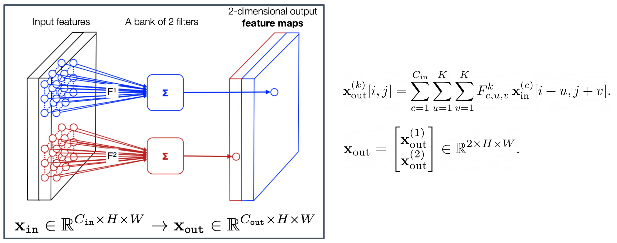 - 입력 텐서는 3개의 채널(R, G, B와 동일한 구조)을 가지므로, 필터는 모든 입력 채널에 대해 가중치를 포함해야 한다.