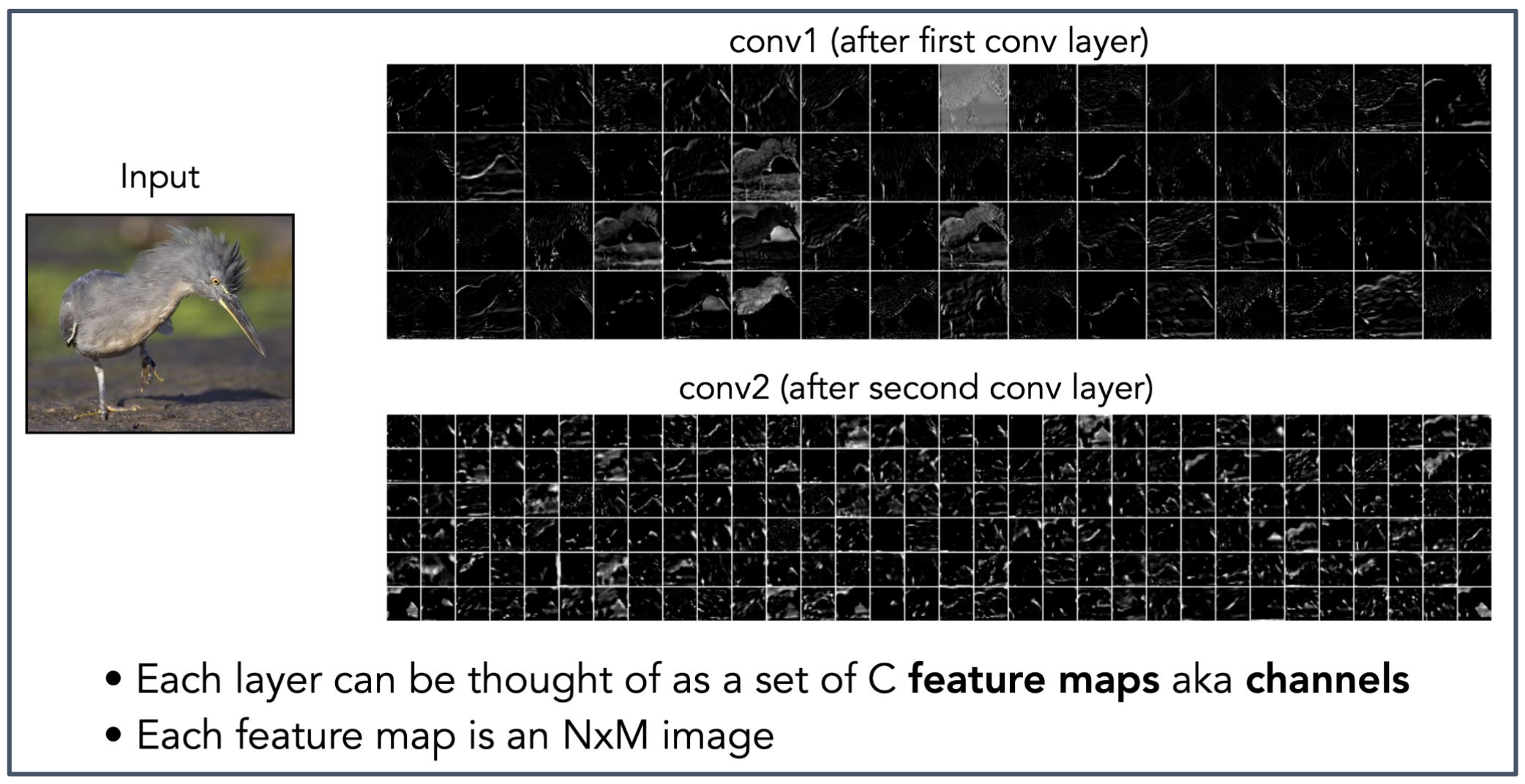 - 각 특징 맵은 $N \times M$ 형태의 2차원 이미지이며, 여러 개의 특징 맵이 쌓여 채널을 이룬다.