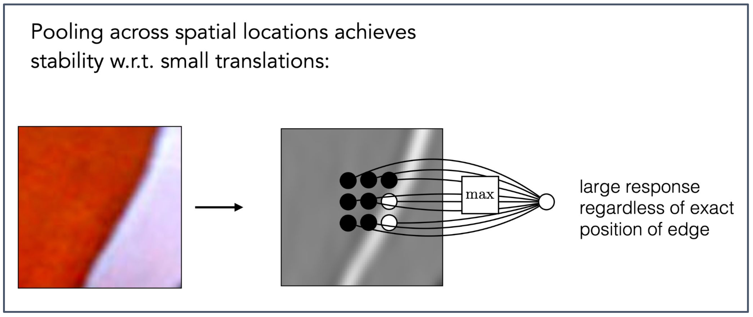 공간적 위치(spatial locations)에 걸친 풀링은 작은 평행 이동(small translations)에 대해 안정성(stability)을 달성한다.large response regardless of exact position of edge