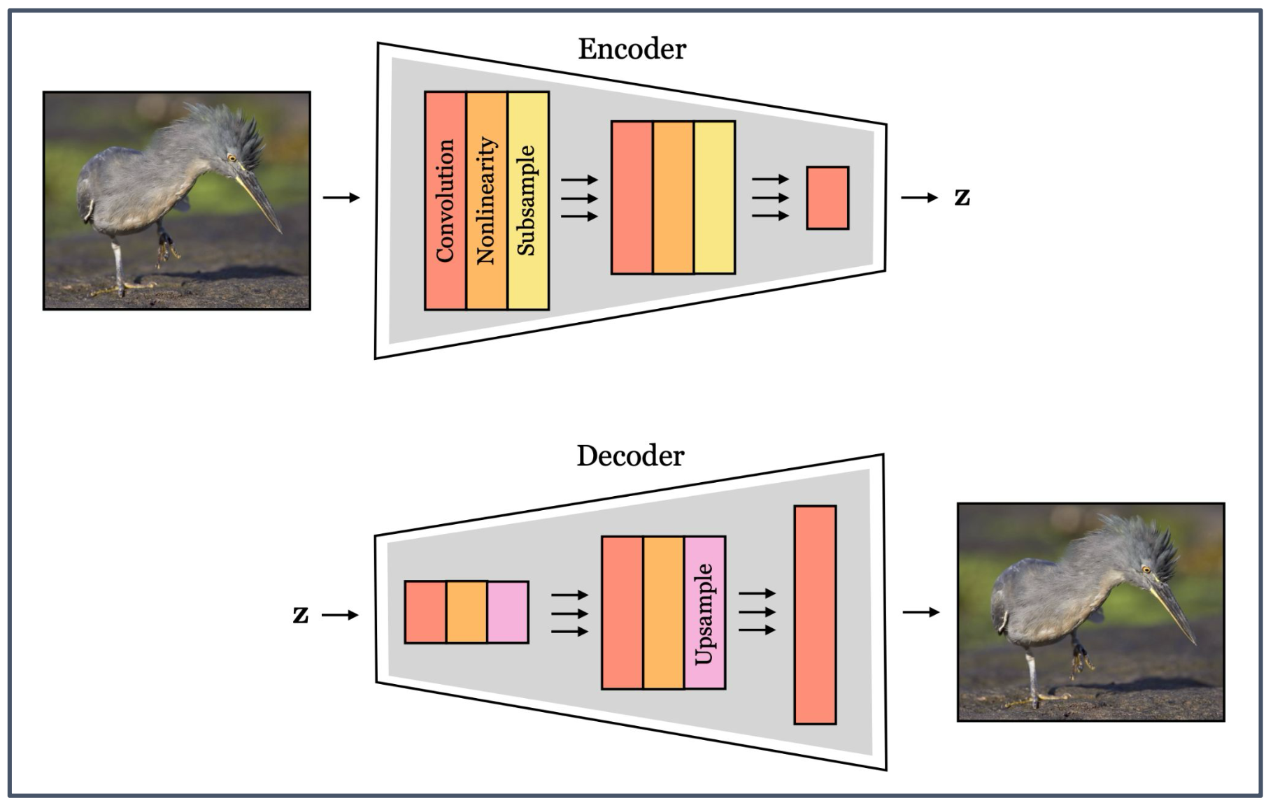 - 잠재 벡터 $z$ 를 업샘플링(upsample)하여 다시 원래와 유사한 형태로 복원한다.