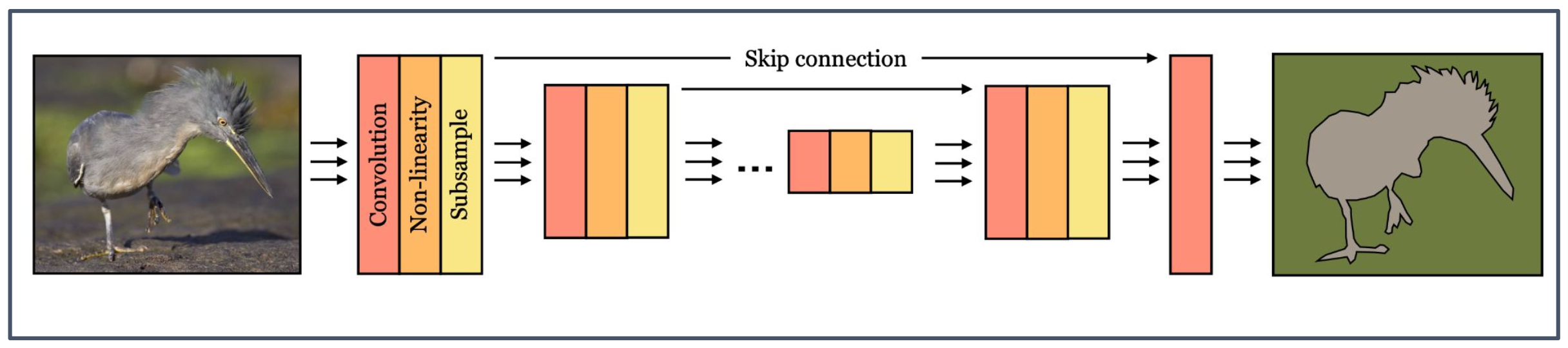 - 인코더(Encoder): 합성곱(convolution), 비선형성(non-linearity), 하위 샘플링(subsample)을 통해 입력 이미지를 점차 축소하며 특징을 추출한다.
