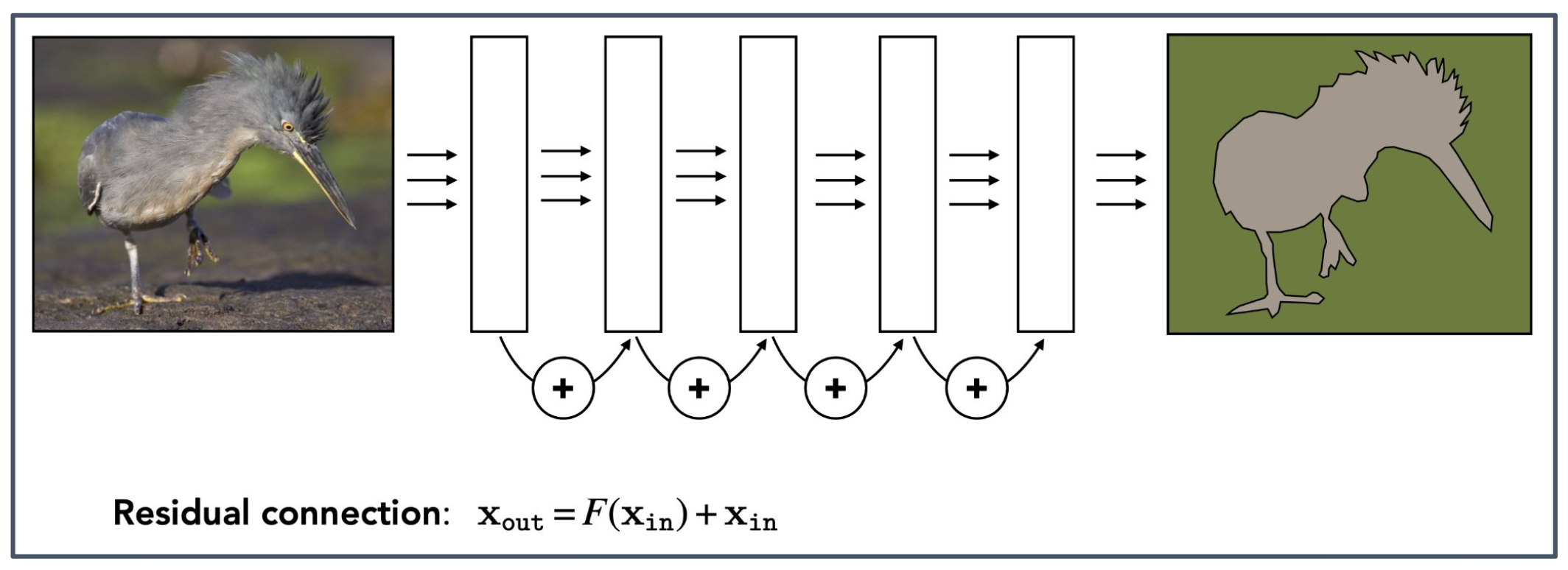 - 이를 해결하기 위해 잔차 연결(residual connection) 을 도입하여, 입력 $x_{\text{in}}$ 을 출력에 직접 더해준다.