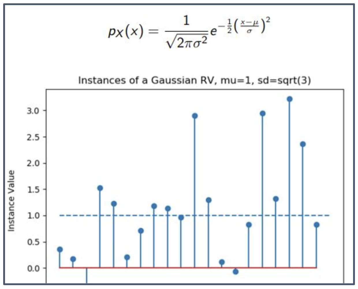 - 이 그래프는 평균이 $\mu = 1$, 표준편차가 $\sqrt{3}$ 인 단변량 가우시안 확률변수(univariate Gaussian RV)에서 생성된 여러 표본(instance)들을 보여준다.