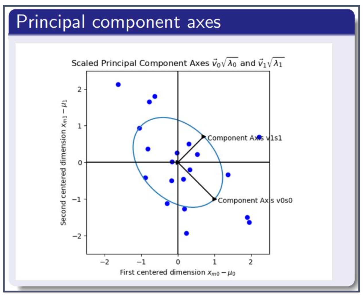 - 즉, 화살표들이 모여 있는 중심이 평균 $\vec{\mu}$ 이고, 화살표들의 퍼짐과 방향성은 공분산 $\Sigma$ 에 반영된다.