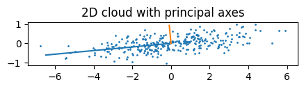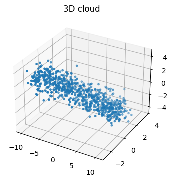 $ \mathbb{R}^3 $에서 거의 1차원에 가까운 필라멘트 형태의 데이터를 합성하고, 점구름을 시각화한 뒤, 2차원 PCA 투영 결과와 비교한다.