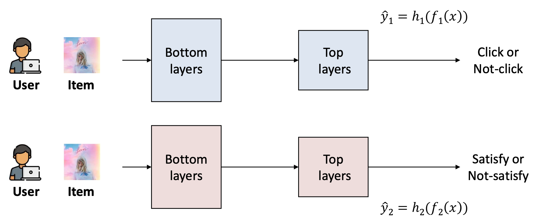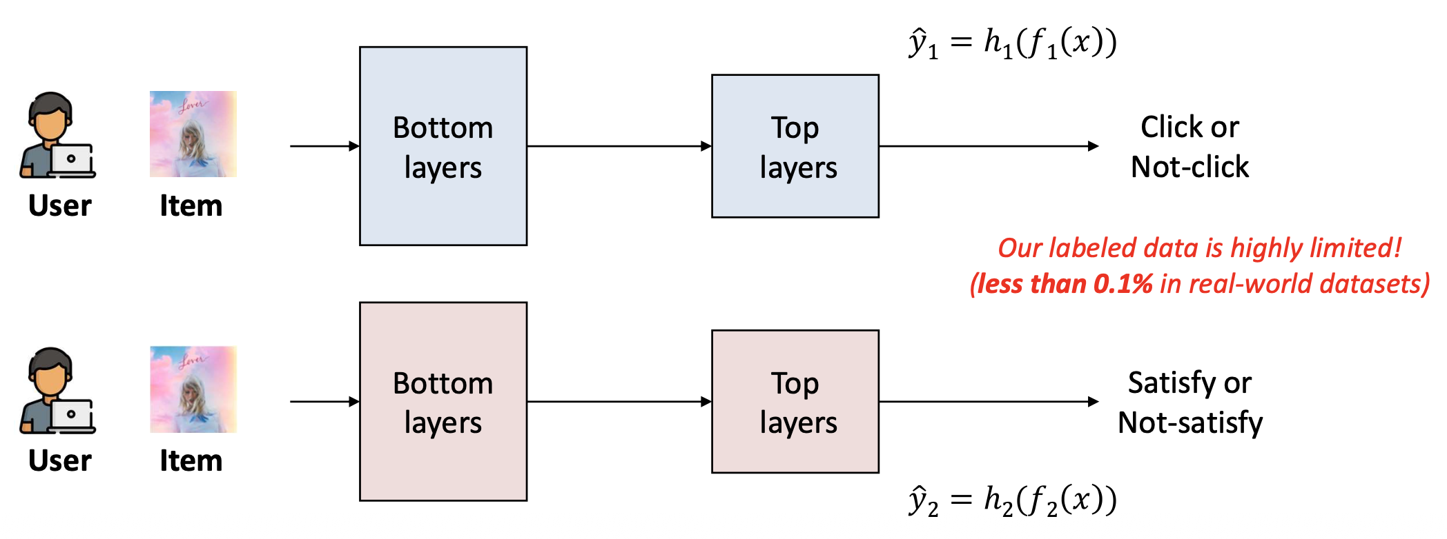 우리는 두 가지 예측 과제(two prediction tasks) 를 수행하고자 한다.- (1) 참여도(Engagement): 사용자가 아이템을 클릭(click)할지 여부