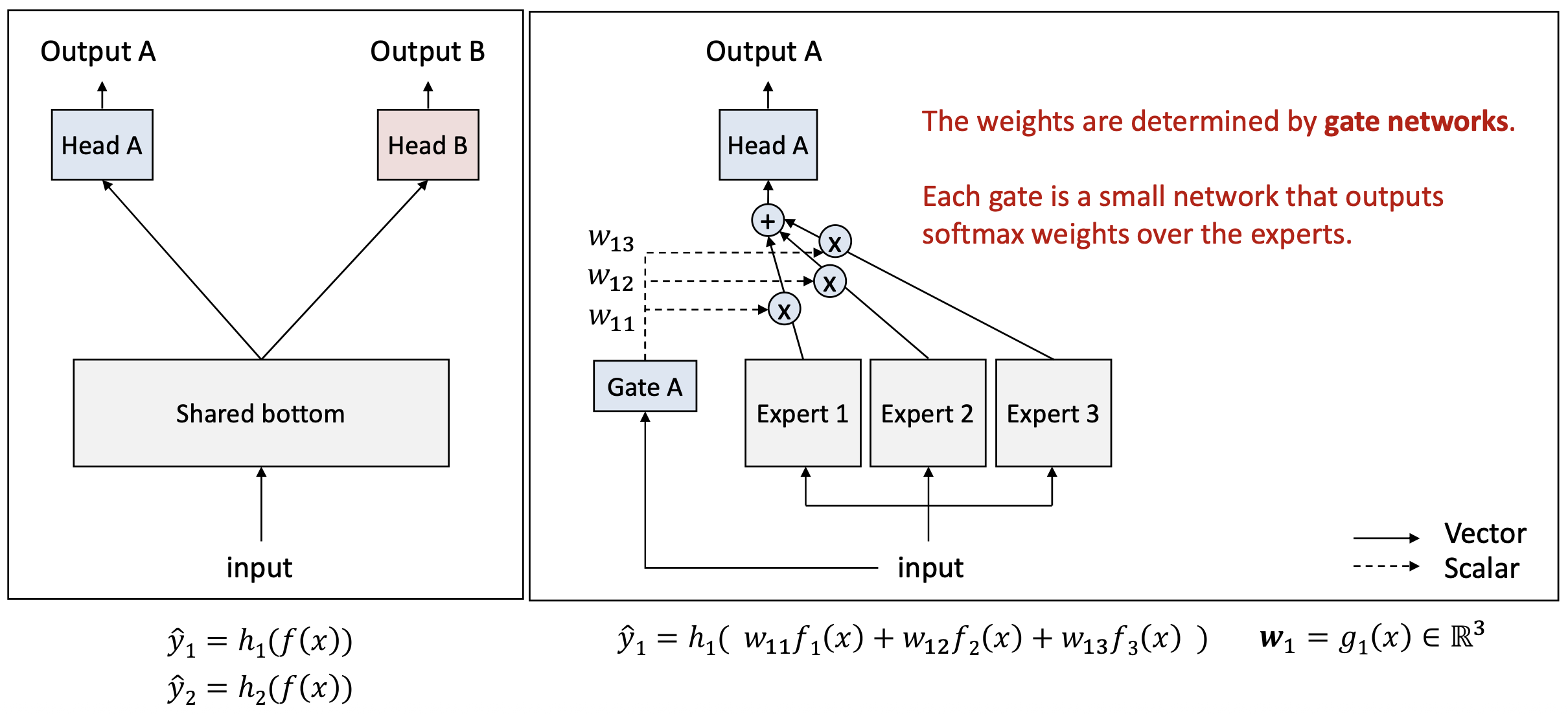 - 게이팅 가중치 계산: \(w_k = g_k(x) \in \mathbb{R}^M\)