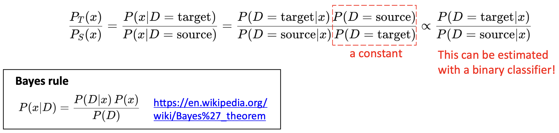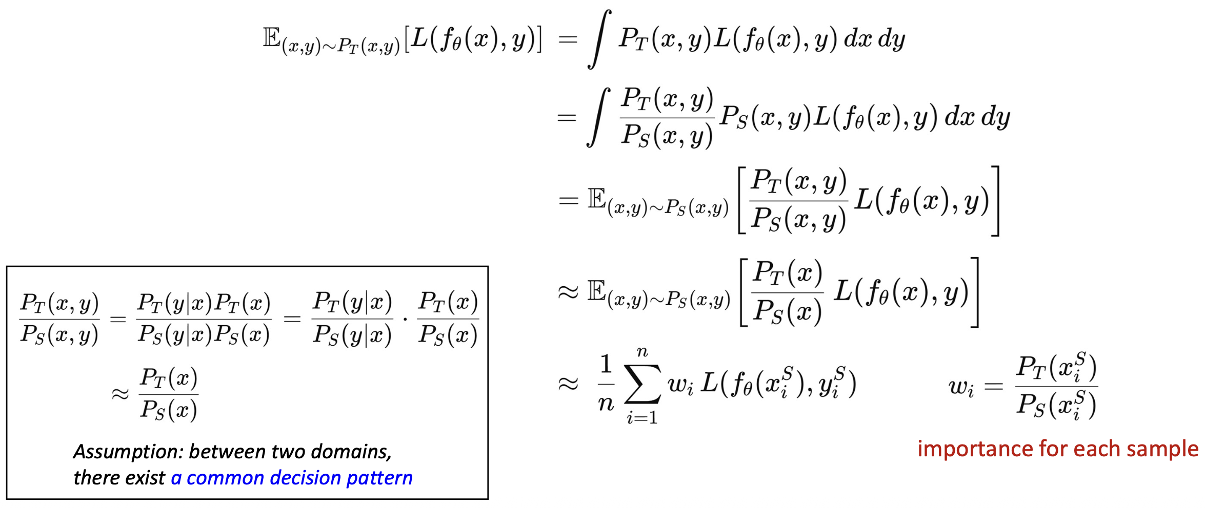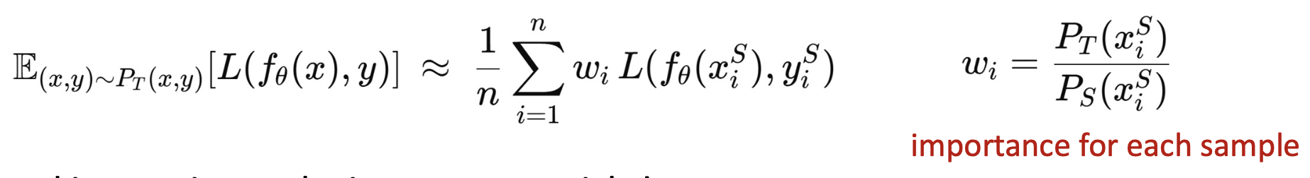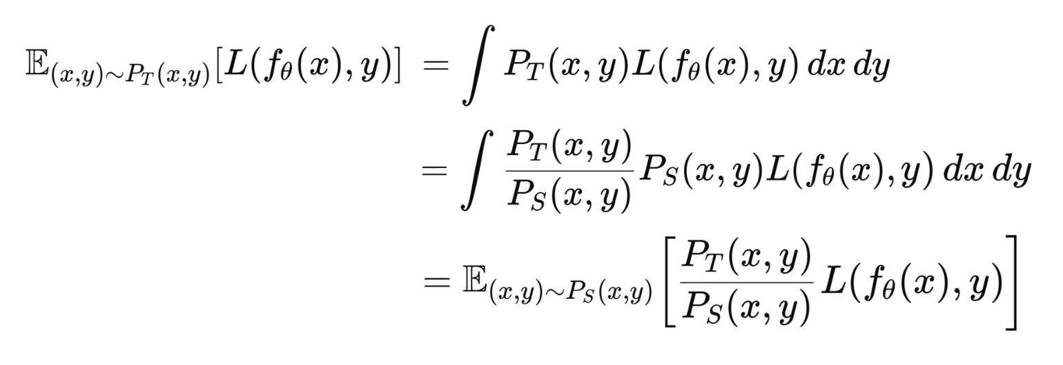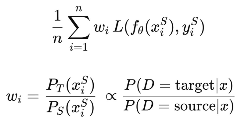 타깃 분포 $P_T(x)$ 하에서 더 높은 확률(more likely) 을 가지는 소스 예시(source examples)의 가중치를 높인다(upweight).