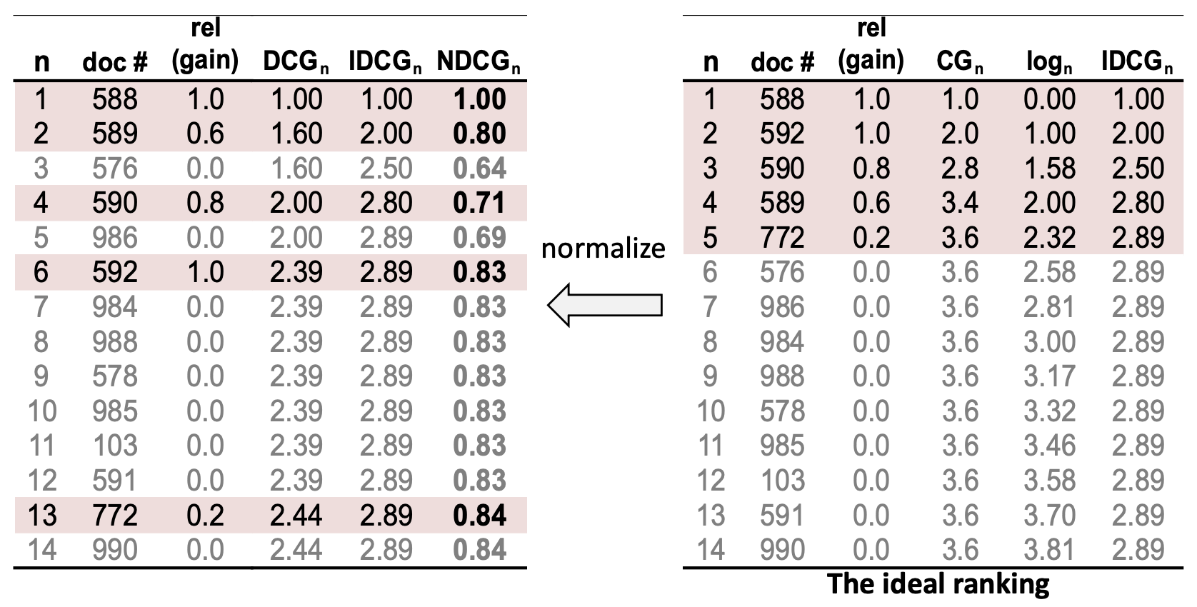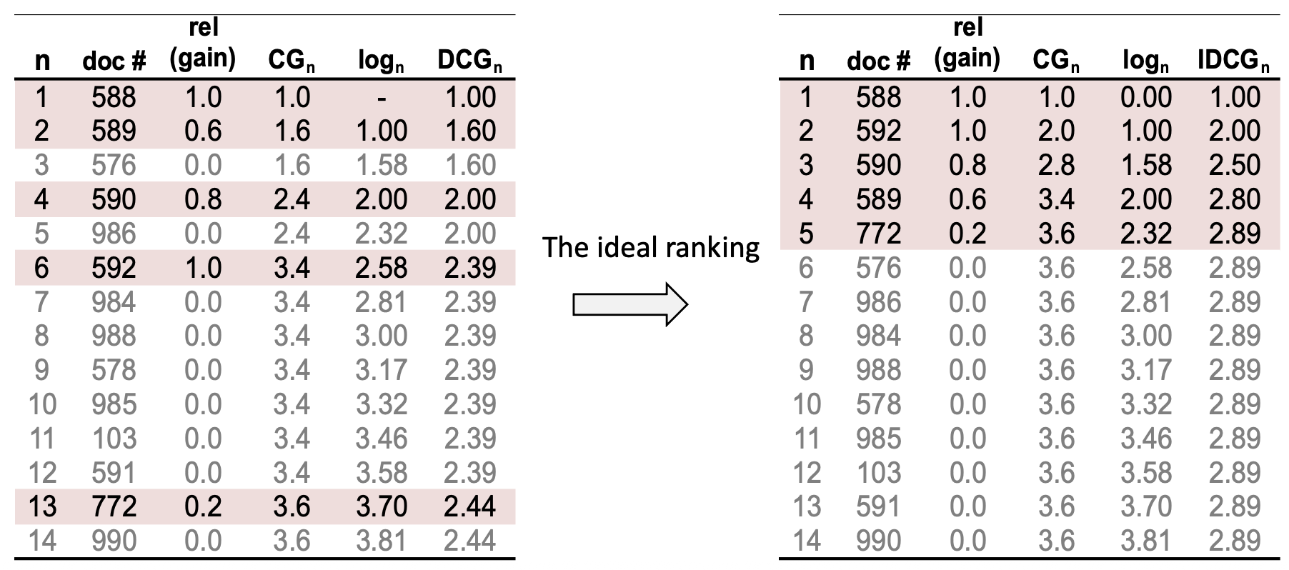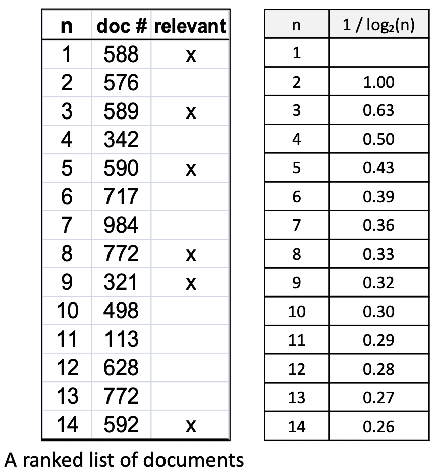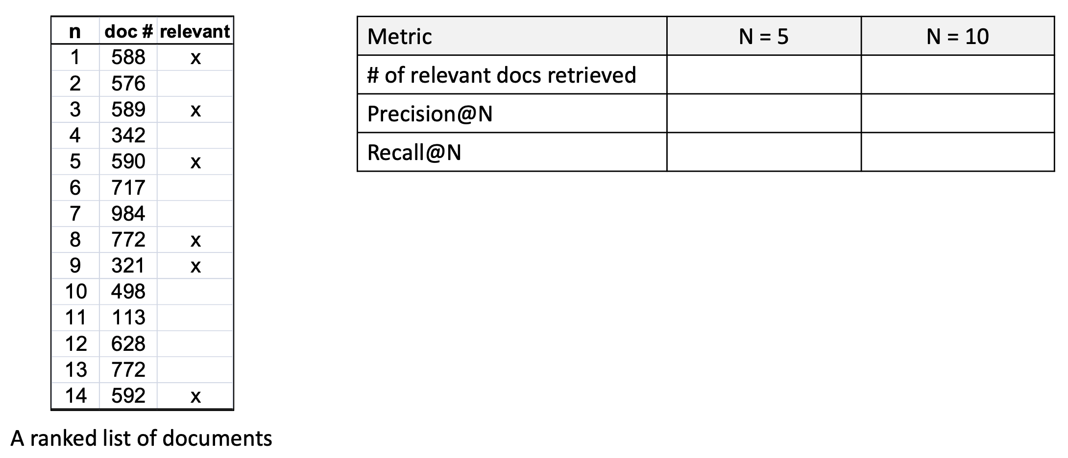 Top-N으로 순위화된 문서 목록이 주어졌을 때, 우리는 검색 결과의 품질을 평가한다.