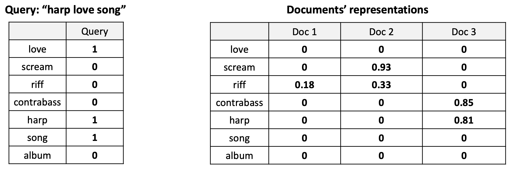 - 쿼리와 문서를 단어 개수 기반의 희소 벡터(sparse vectors)로 표현한다.