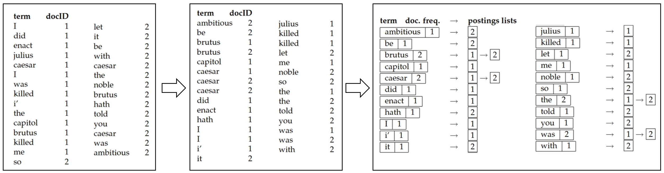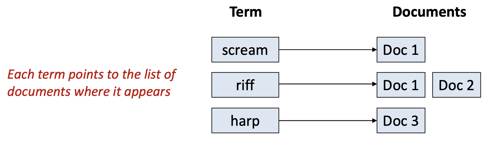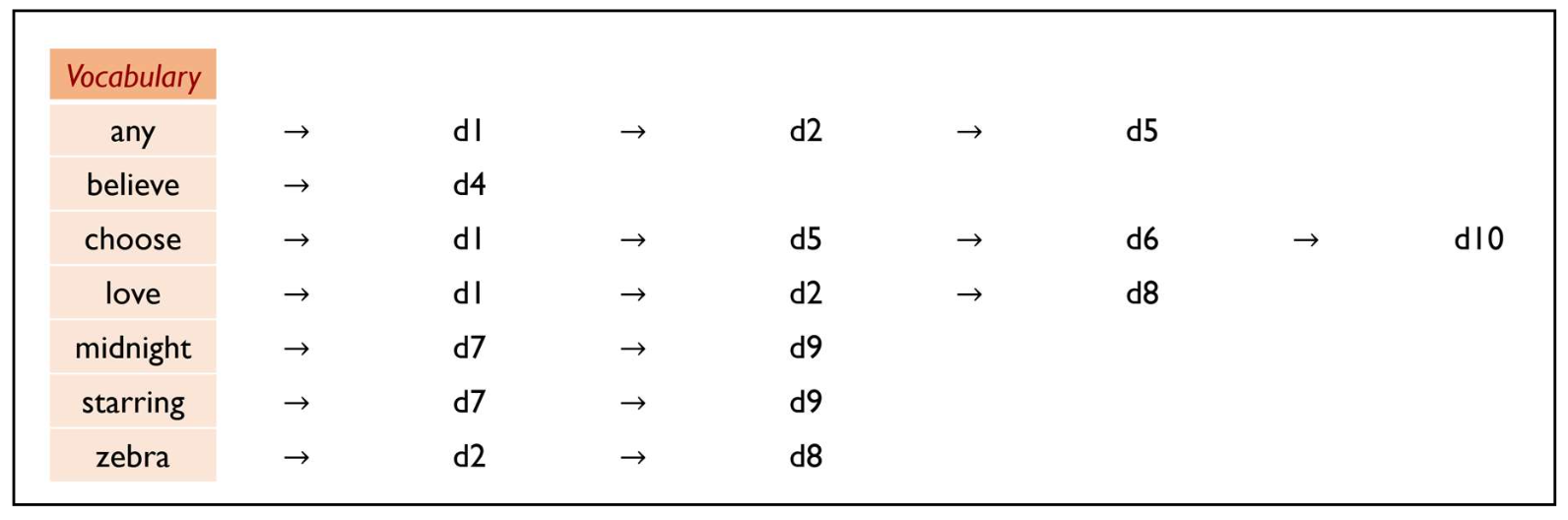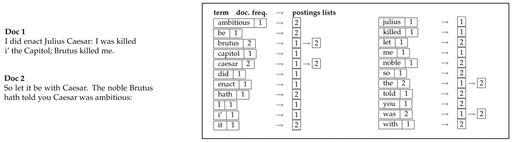 - 큰 말뭉치 위에서 효율적인 검색을 가능하게 하는 역색인(inverted index) 을 사용한다.
