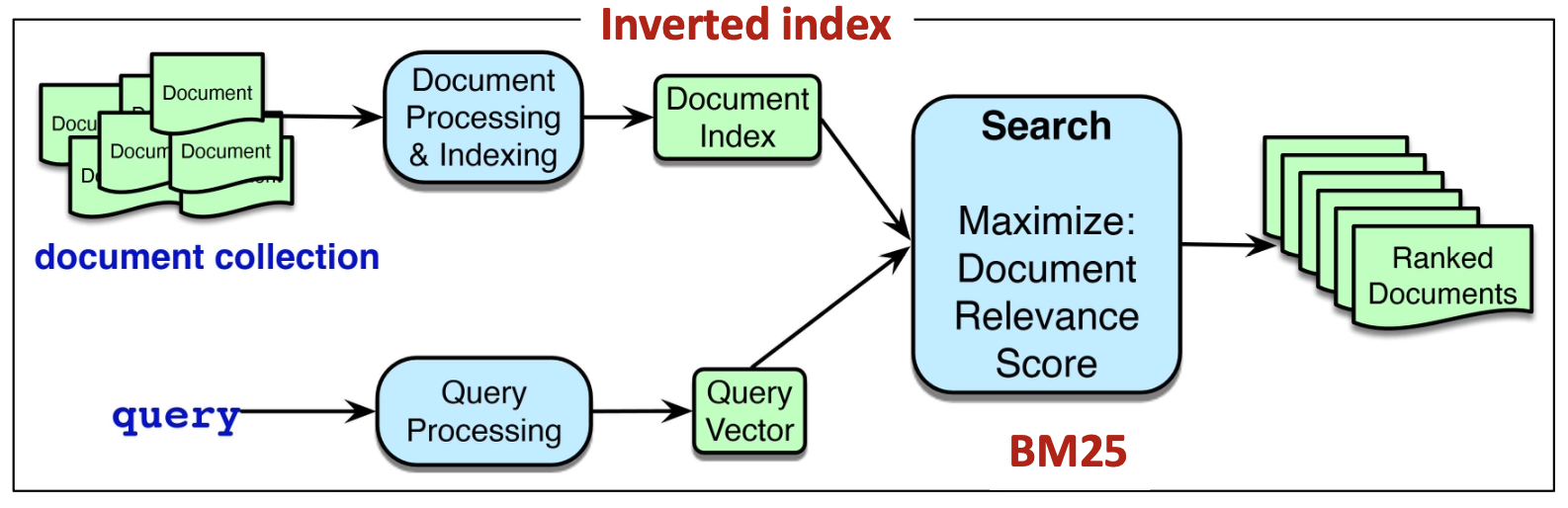 - 쿼리와 문서를 단어 일치 기반의 희소 벡터(sparse vectors) 로 표현한다 (TF-IDF, BM25).