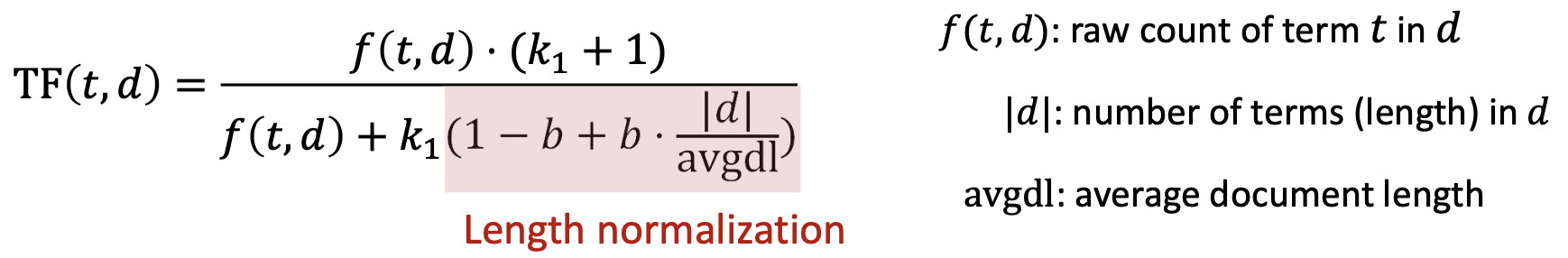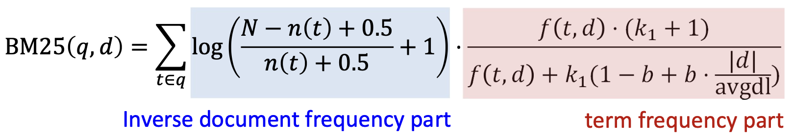 TF와 IDF는 BM25에서 다르게 정의되며, 이에 대해서는 이후에 자세히 살펴본다.