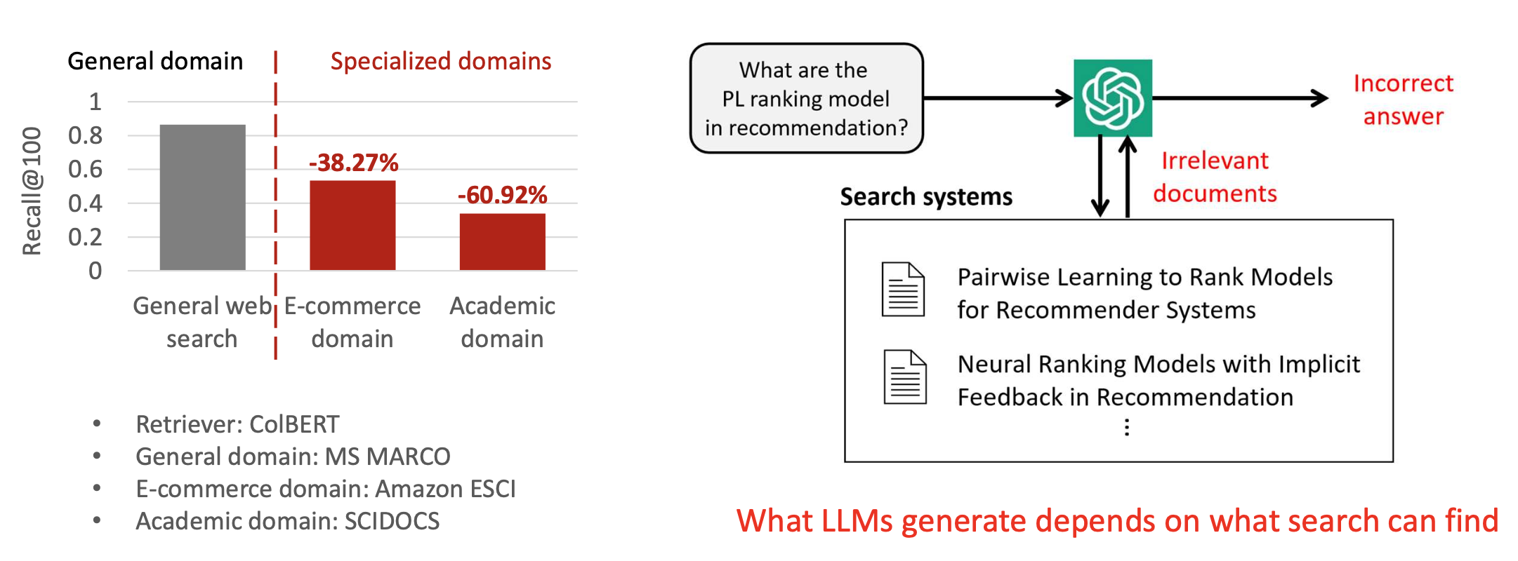 특수화된 도메인(specialized domains)을 다루는 것에 어려움을 겪는다.검색 시스템은 LLM 기반 생성(LLM-based generation)의 근본적인 병목(fundamental bottleneck) 이다.