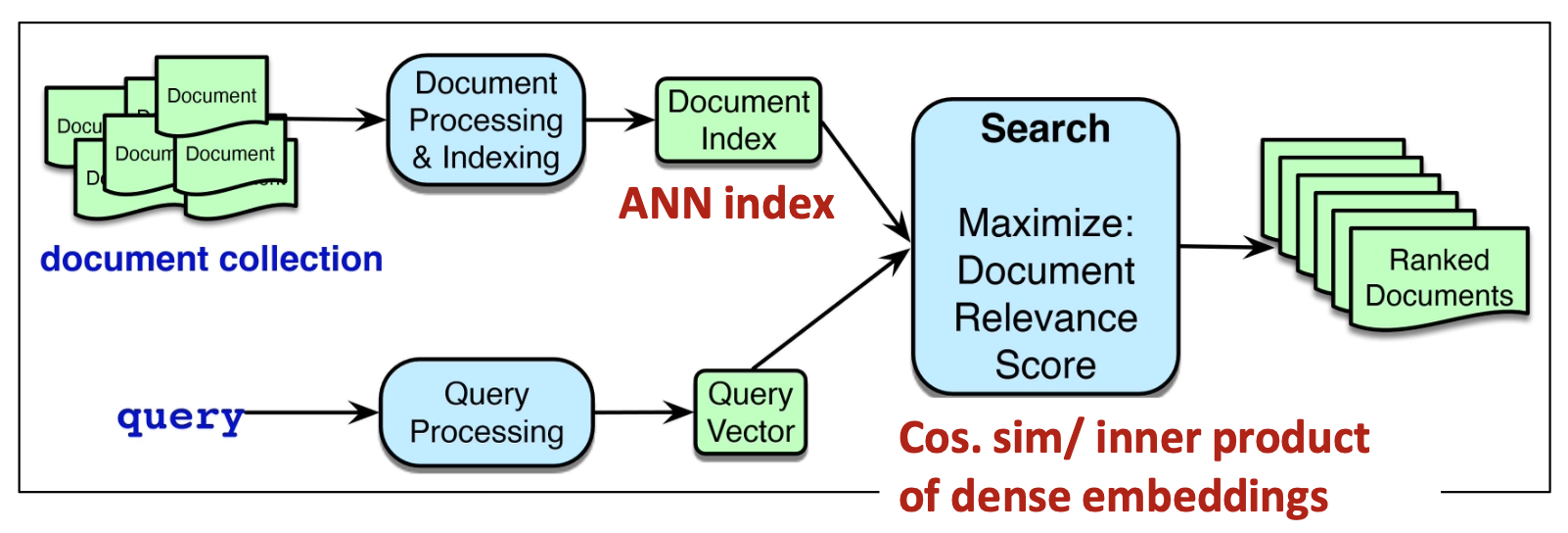 2. 쿼리 시점에는 입력 쿼리 또한 밀집 벡터(dense vector)로 인코딩되며,