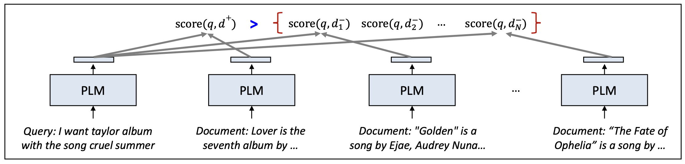 쿼리 $q$ 와 문서 집합 $\lbrace d^{+}, d_1^{-}, d_2^{-}, \dots, d_N^{-} \rbrace$ 이 주어졌을 때,