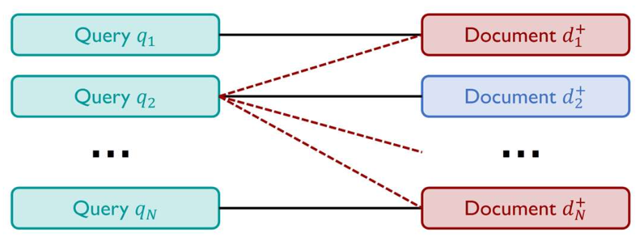 $N$개의 (쿼리, 긍정 문서) 쌍을 하나의 배치로 GPU에 넣는다.