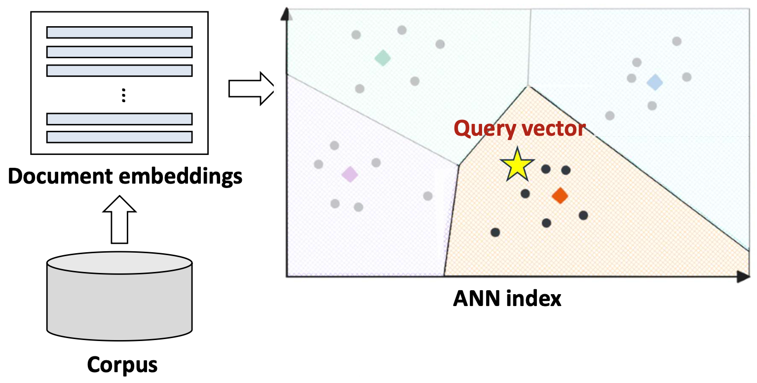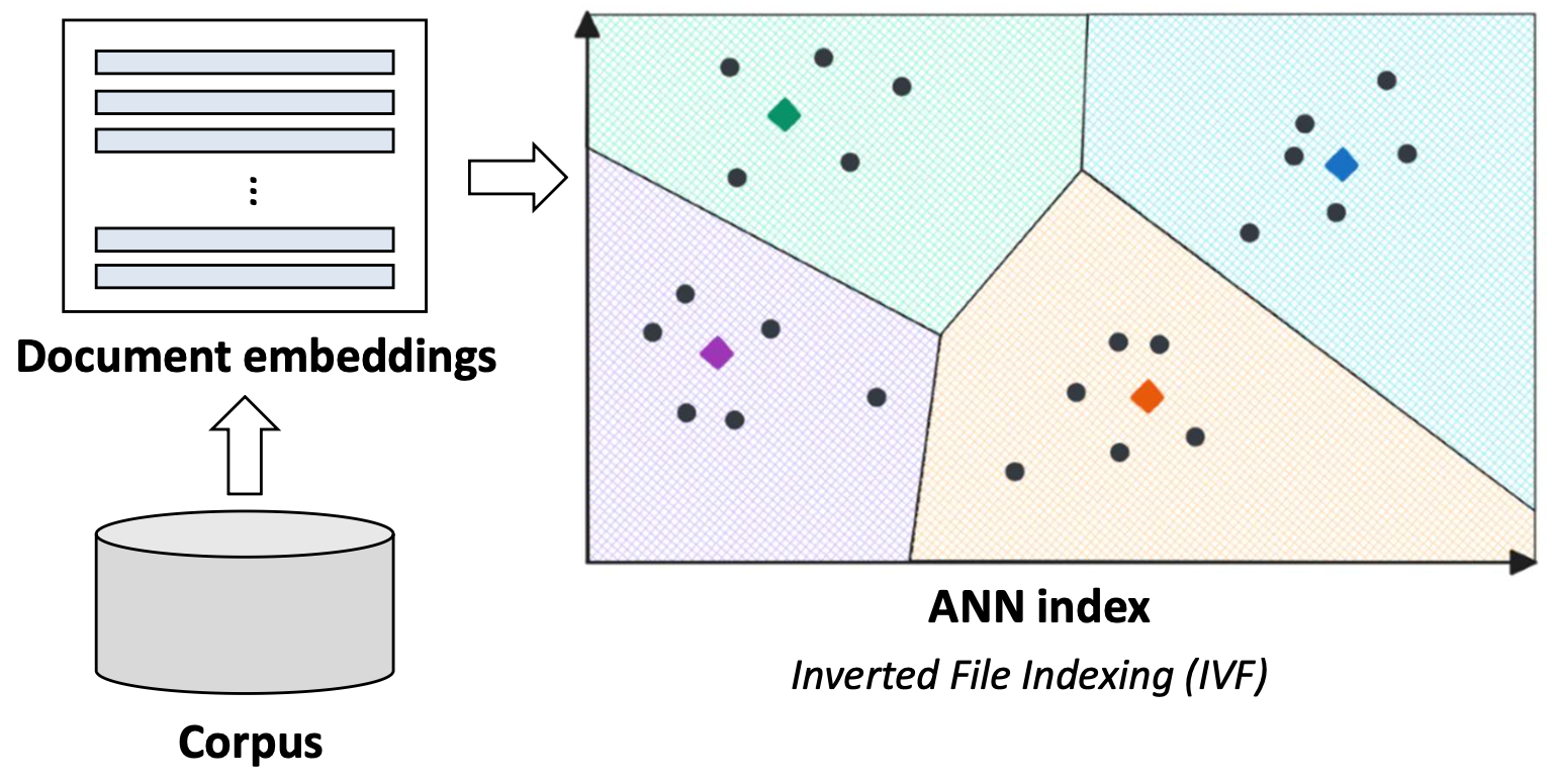- ANN 인덱스는 문서 벡터들을 클러스터들(색으로 구분된 영역들)로 조직한다.