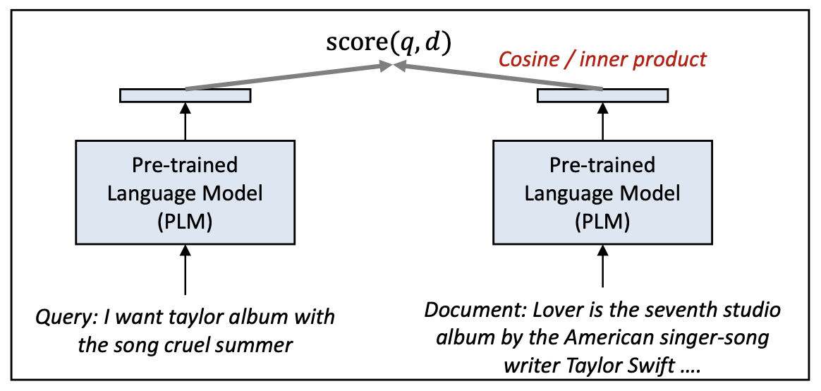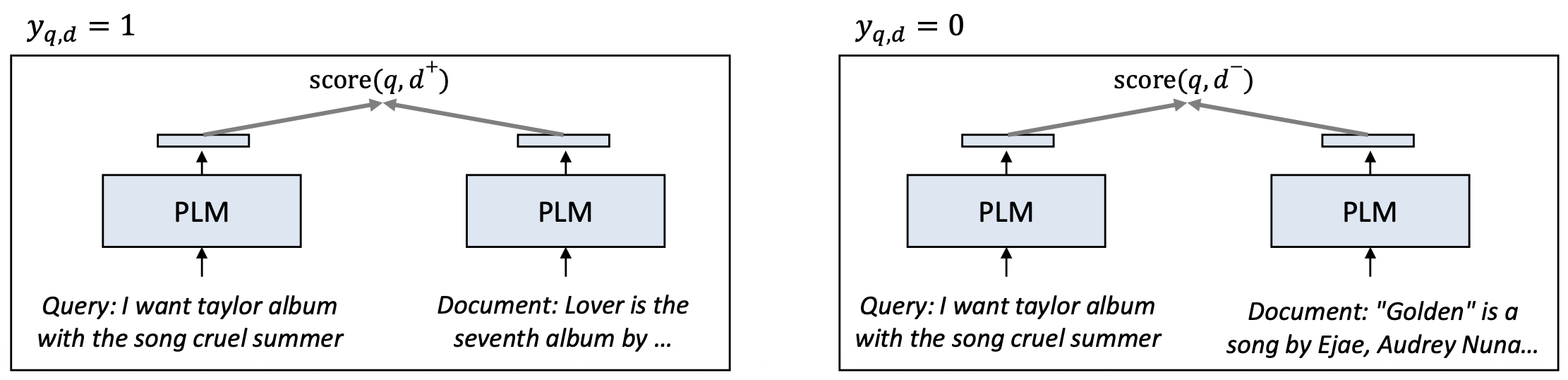 \[\hat{y}_{q,d} = p(\text{relevant} \mid q, d) = \sigma(\text{score}(q,d))\] \[\text{score}(q,d) = e_q^{\top} e_d\]