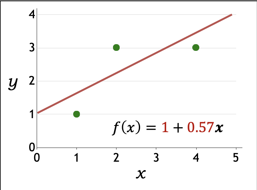 \[Loss([1,1], [1,0.57]) = ([1,0.57] \cdot [1,1] - 1)^2\] \[Loss([2,3], [1,0.57]) = ([1,0.57] \cdot [1,2] - 3)^2\] \[Loss([4,3], [1,0.57]) = ([1,0.57] \cdot [1,4] - 3)^2\]