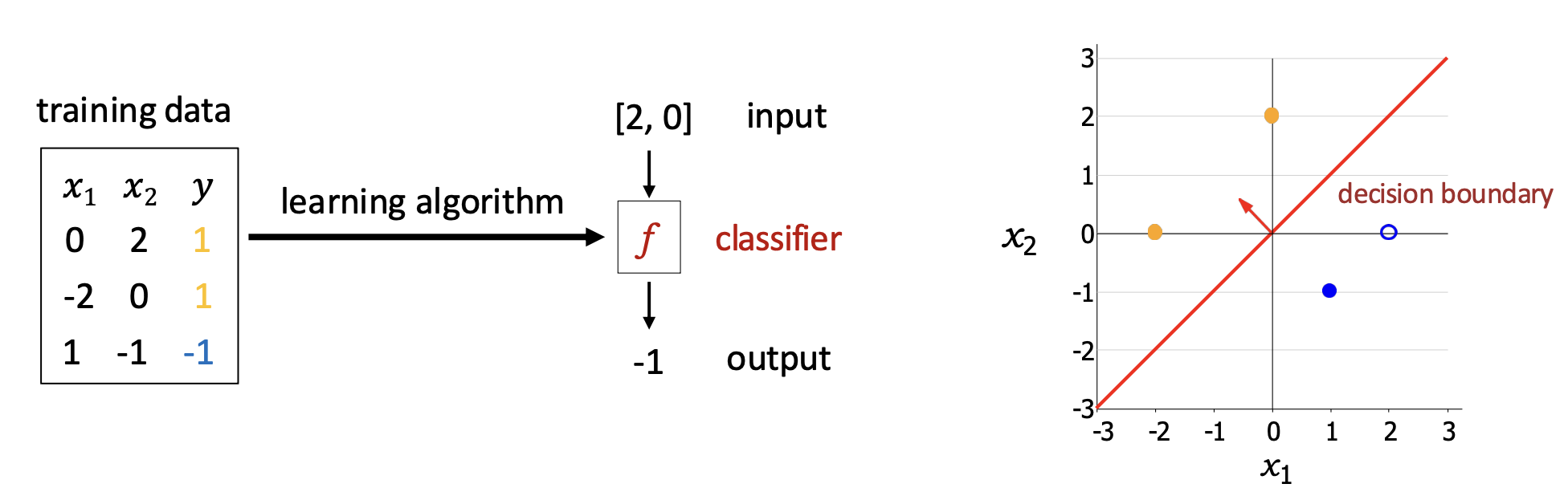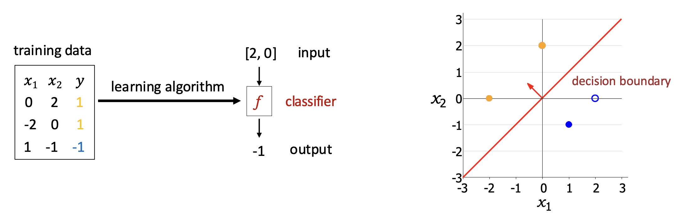 - 분류(Classification): 미리 정의된 범주 집합 $C$에서 이산적인 레이블을 예측하는 것