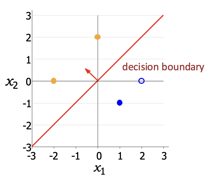 특성 벡터에 첫번째 항목 1이 없으면 $\mathbf{w} \cdot \varphi(x)$가 원점 밖에 지나지 못함