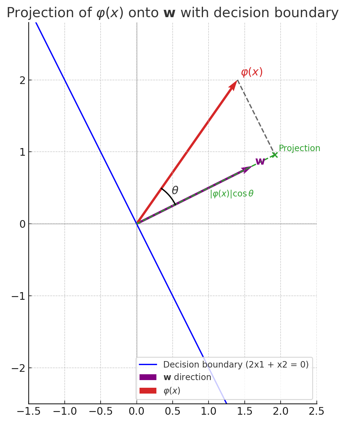 - $\mathbf{w}\cdot \varphi(x)$ 는 입력 $x$ 가 결정 경계로부터 얼마나 떨어져 있는지를 나타낸다.