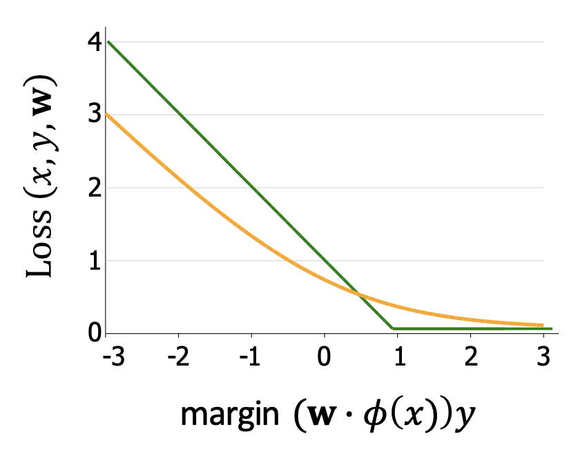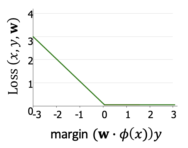 \[Loss_{\text{hinge}}(x,y,\mathbf{w}) = \max\{1 - (\mathbf{w} \cdot \varphi(x))y,\,0\}\]로지스틱 손실(Logistic loss):