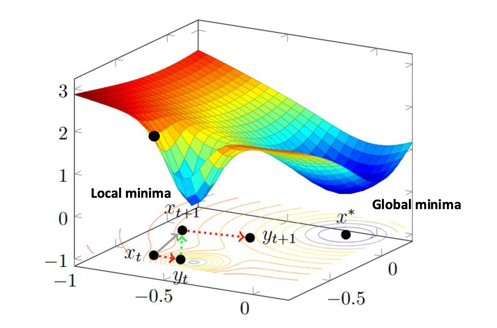 - 경사하강법(GD)은 결정적(deterministic) 방식으로 이동하므로, 한 번 지역 최소값(local minima) 에 빠지면 그 안에 머무르게 된다.