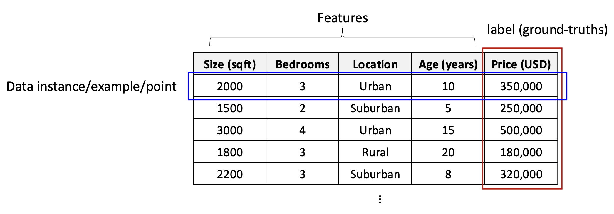 \(D_{train} = \{(x_1, y_1), \dots, (x_n, y_n)\}\)주택 가격 예측을 위한 데이터 예시