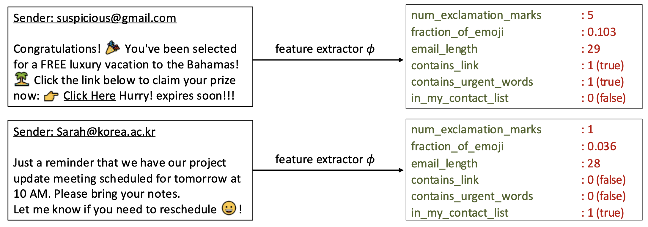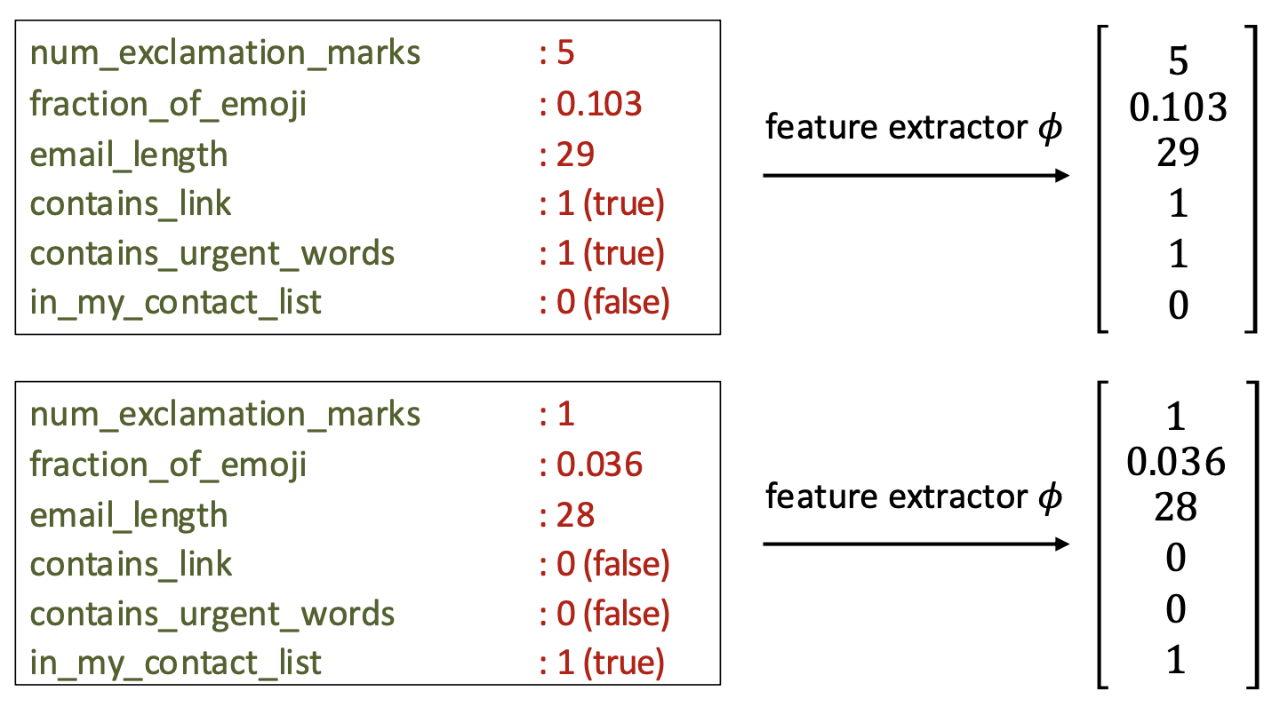→ 이렇게 해야 머신러닝 모델이 더 효과적으로 예측할 수 있다.특성 추출기(Feature extractor): 입력 $x$가 주어졌을 때, (특성 이름, 특성 값) 쌍들의 집합을 출력한다.