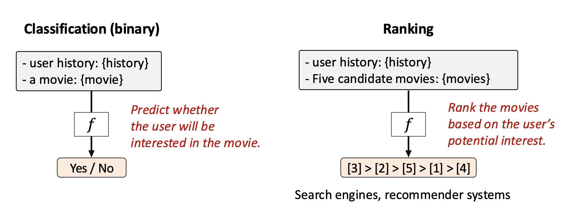 - 랭킹(Ranking): 아이템 집합에서 관련성에 따라 최적의 순서 $\pi$ 를 예측하는 것