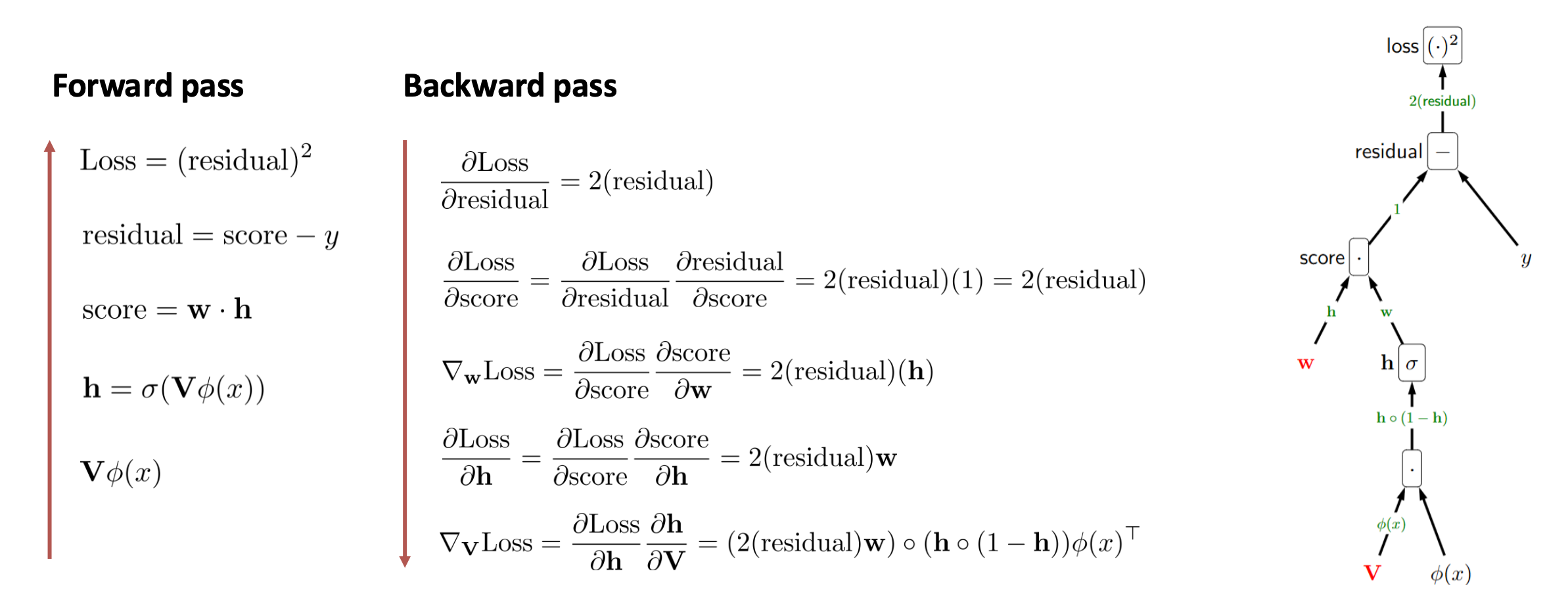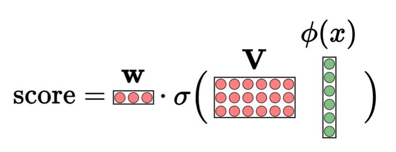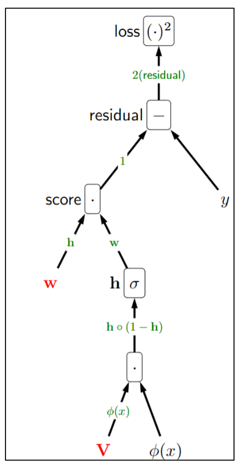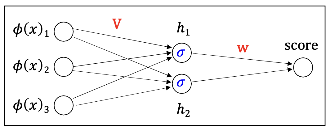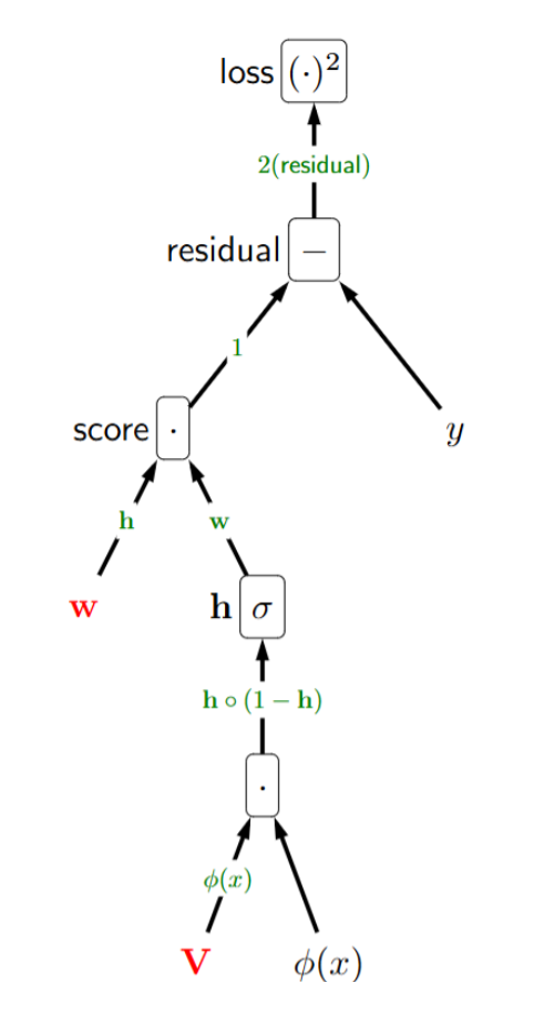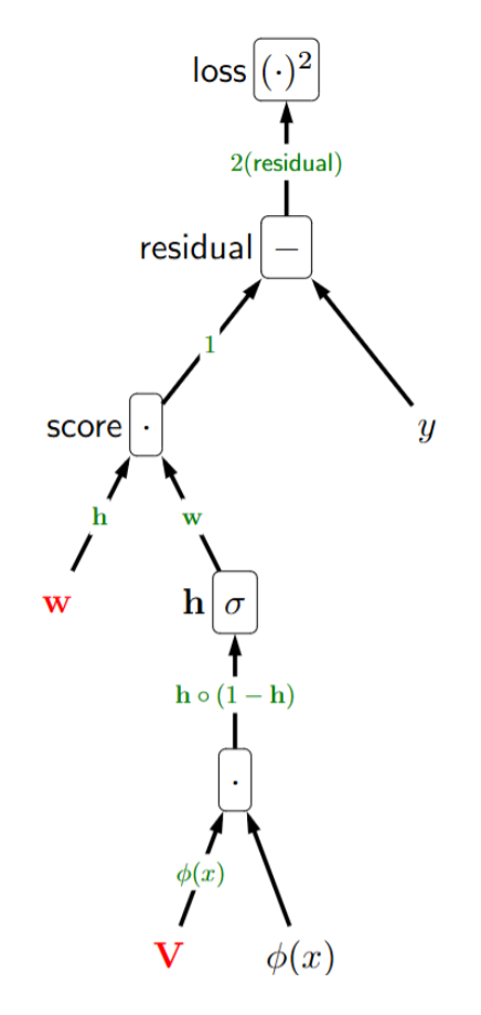 \[\mathbf{w} \;\leftarrow\; \mathbf{w} - \eta \, (2 \cdot \text{residual}) \, \mathbf{h}\] \[\mathbf{V} \;\leftarrow\; \mathbf{V} - \eta \, (2 \cdot \text{residual}) \, \mathbf{w} \circ \mathbf{h} \circ (1-\mathbf{h}) \, \varphi(x)^\top\]